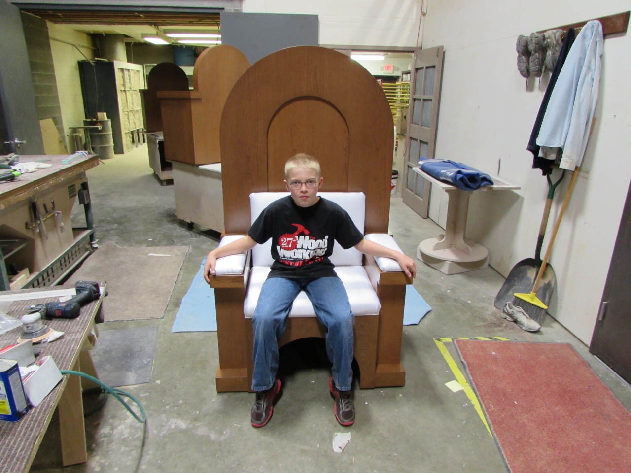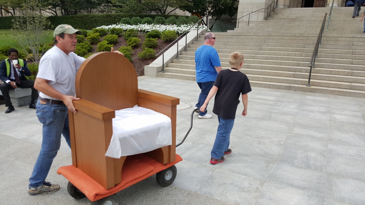 Adam and I came back a week later to help with loading and delivering the chairs. Adam felt the need to do a little load testing on the Papal chair before it got loaded up.