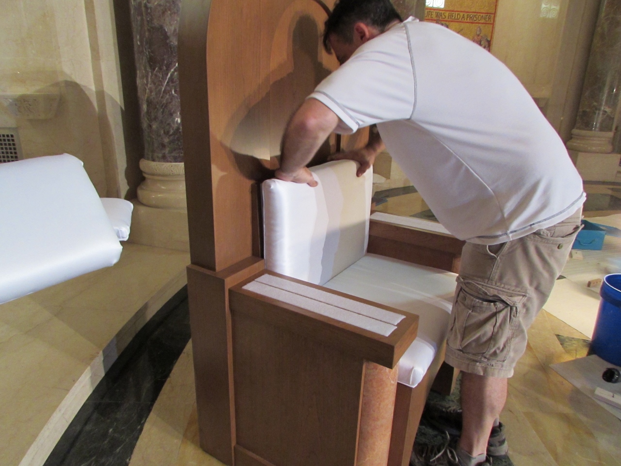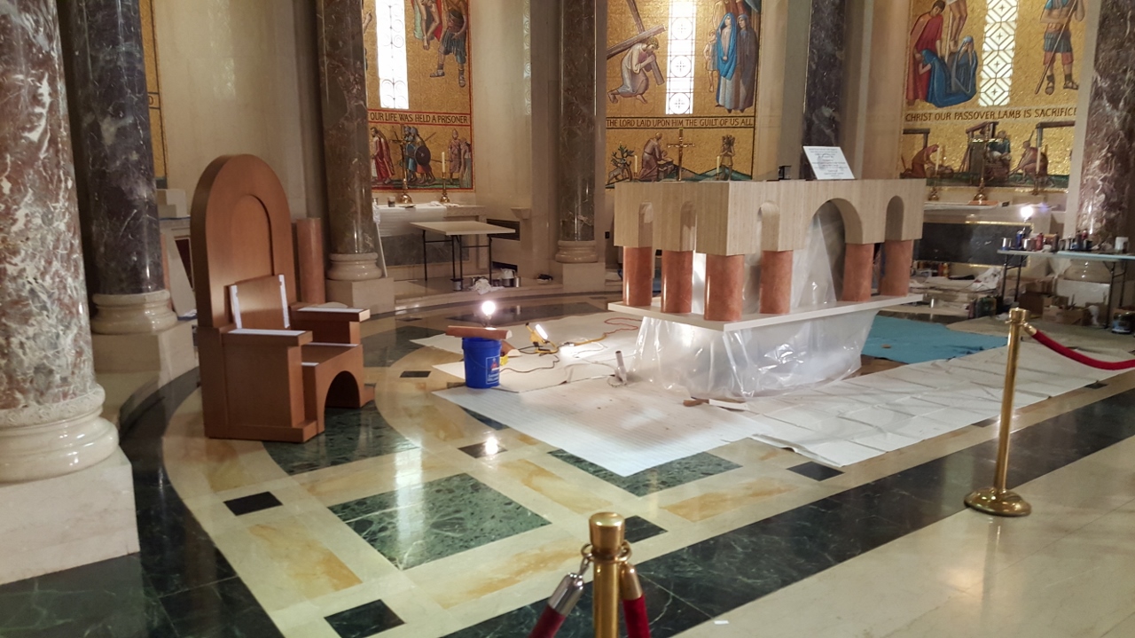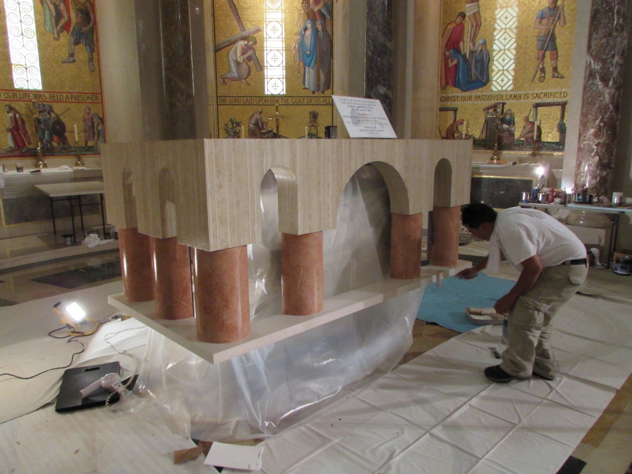 Dave delivered the altar a week or so back, so the faux finisher could start. We placed the Papal chair near the altar because the finisher had been working on the columns for the front of it, and Doug needed to install them.