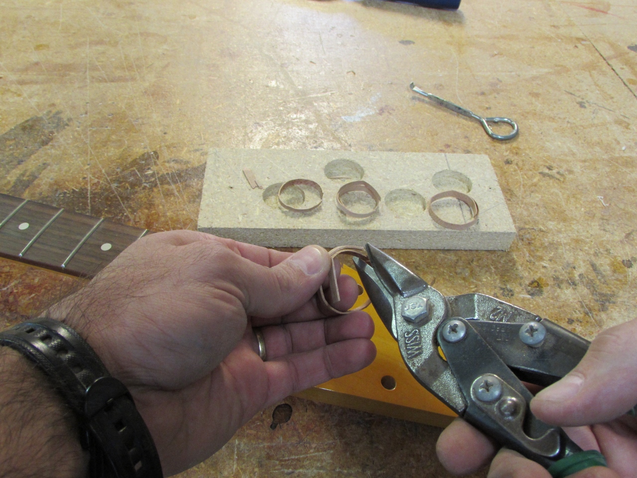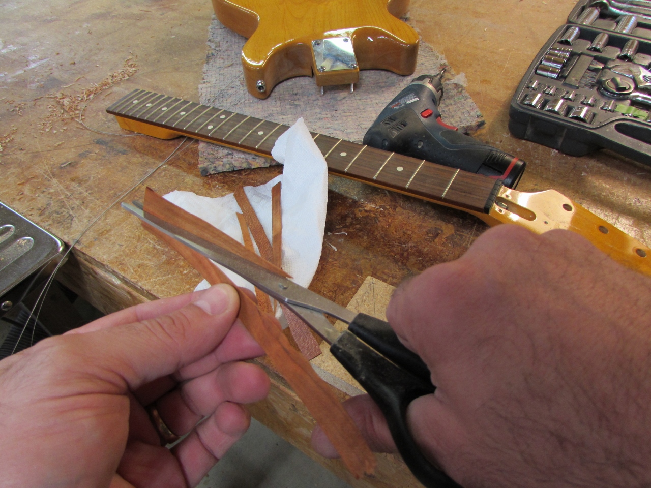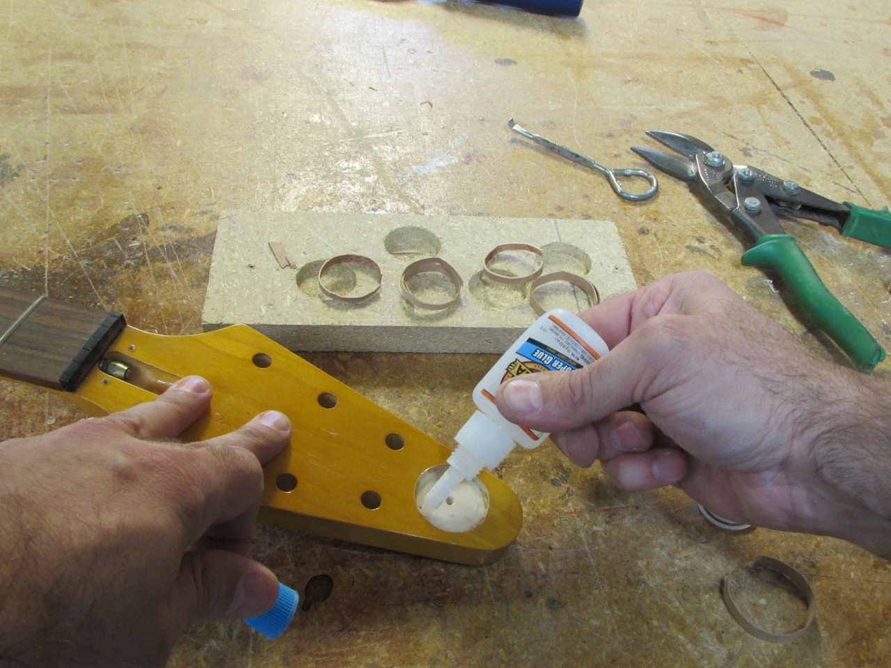 With the strips wet and flexible, I trimmed them down to about 3/16″ wide, then wrapped them around the inside of the pockets I just drilled. I allowed them to dry thoroughly for an hour or two.