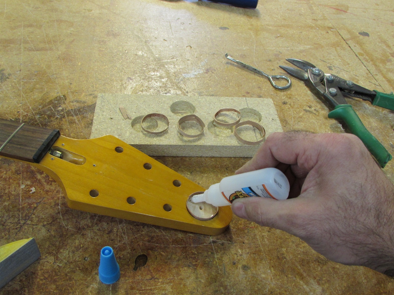 I talked to Bill about whether to buy the correct size drill bit for the rest of the coins he wants to inlay, but he decided he prefers the band of cherry. It frames and highlights the coin. Especially on unstained maple headstocks, where the white blends in with the wood. So I think we are going to stick with this method.
