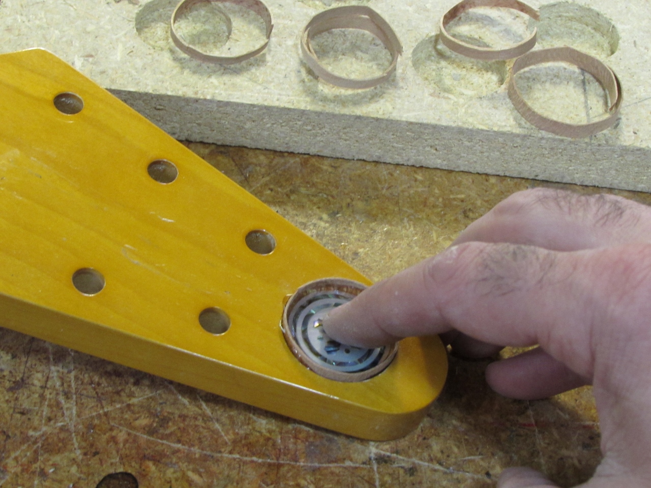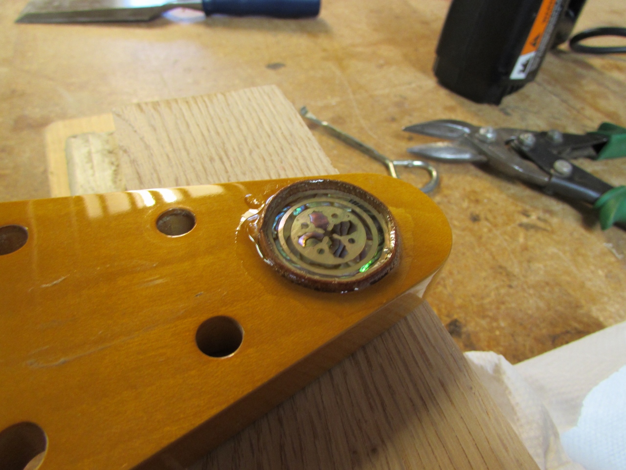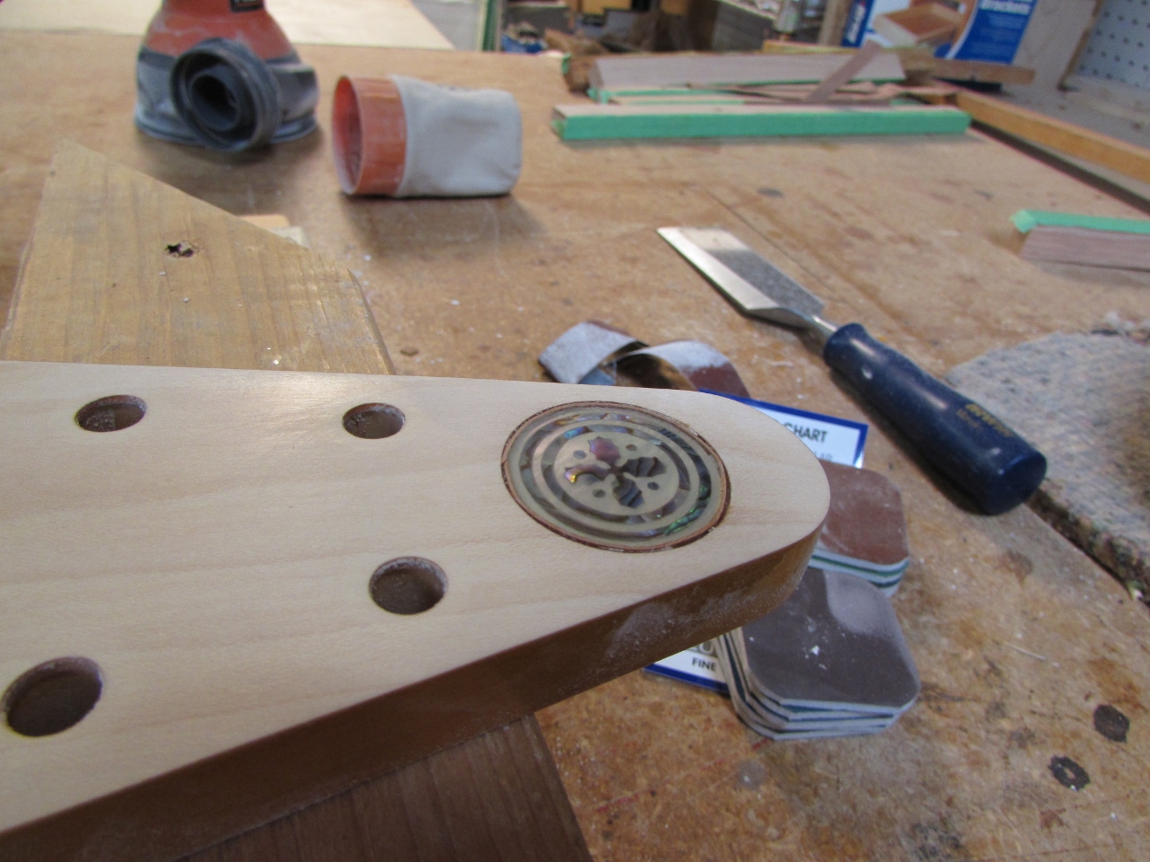 My friend Bill started this project, but immediately ran into problems. He bought some discs with abalone patterns on them, with the intent of inlaying them on guitar headstocks. Unfortunately he did not measure the discs before drilling the recess.
