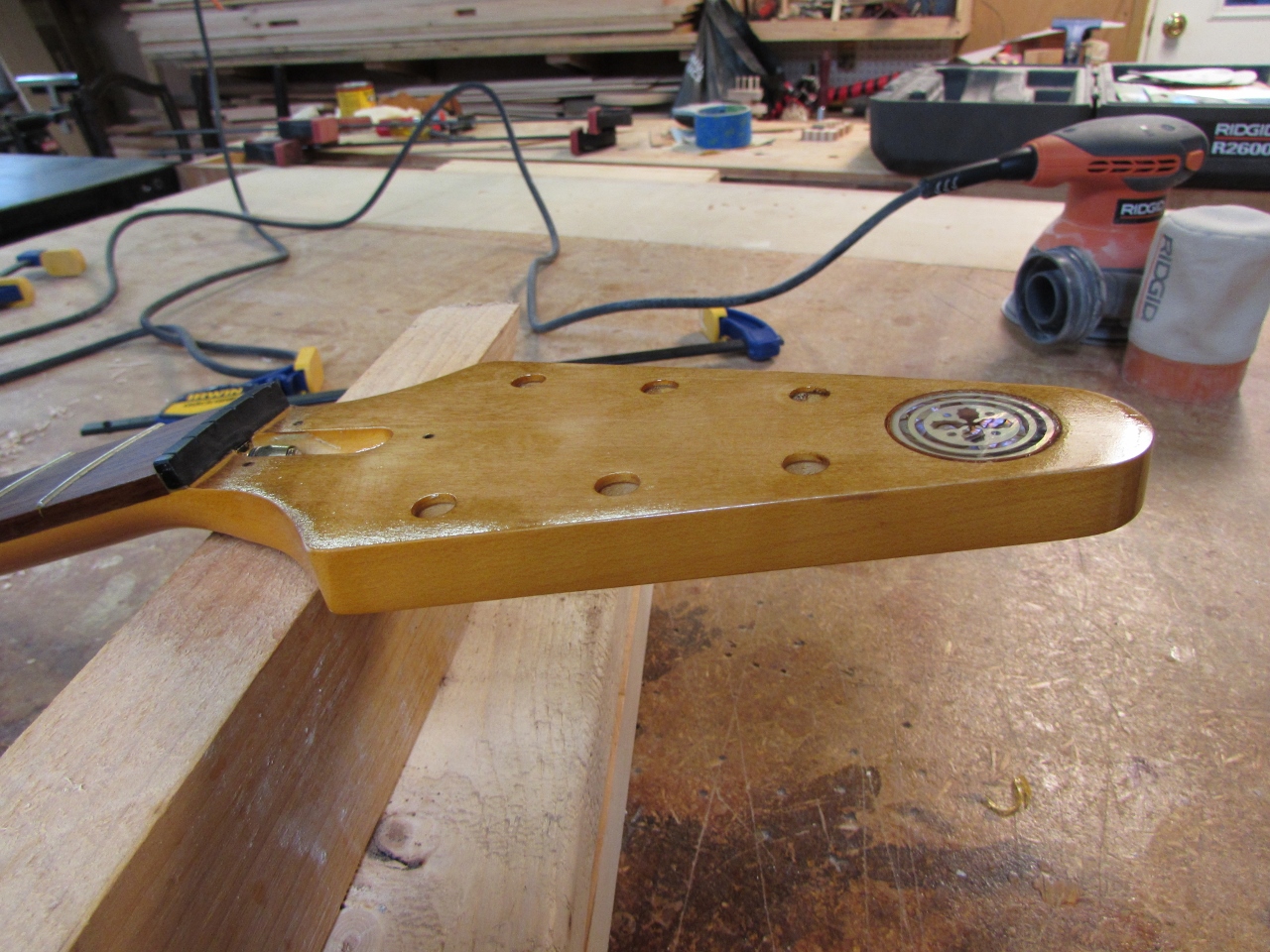 The next problem to address is the fact that I removed all the amber color from the headstock. I assumed that it was stained, then lacquered, but apparently they tinted the lacquer, placing all the color in the finish itself. I still had some water-based dye from the bass guitar build, so I went ahead and rubbed some in. I applied two coats to get it close to the amber color on the rest of the neck.