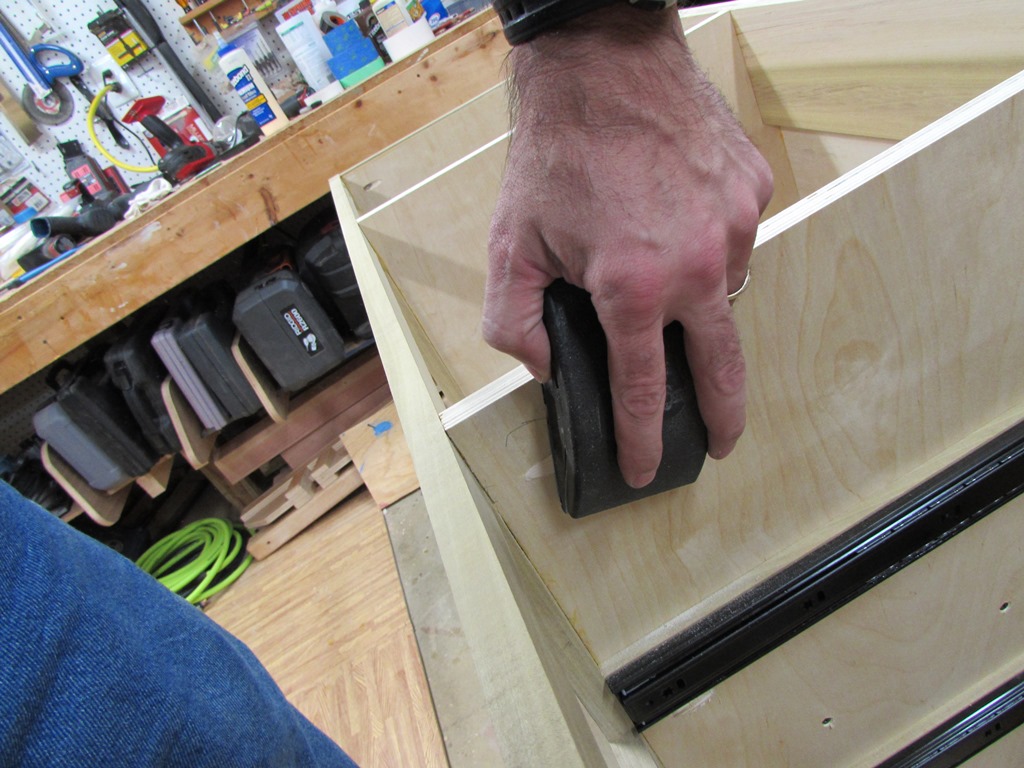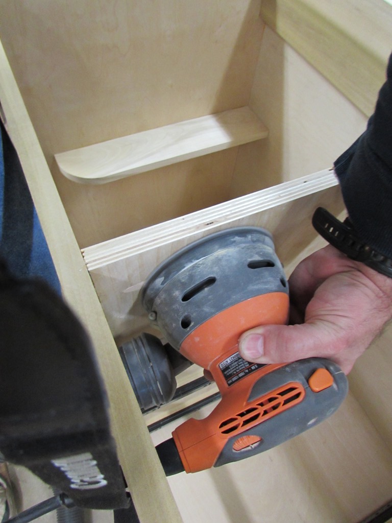 Once the drawers had set for a bit, I pulled the clamps and started sanding them down.