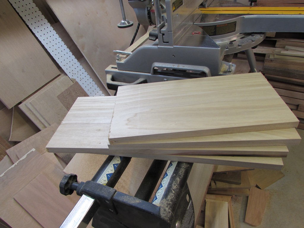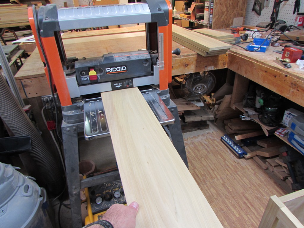 Now that I have exhausted everything I can think of to avoid doing the drawers, it is time to start on them. I calculated how long each side of the drawer was, then added them together and added a couple of inches. This gave me a board length that would be long enough to create all the sides for a single drawer. I cut six boards this length, then planed them down. This is easier than cutting and planing 24 individual boards. If I did them separately, I would have to add a couple of inches to each board to allow for sniping on the planer. This way, I only waste about 2″ per drawer rather than per side. It also guarantees grain match and thickness for each drawer, if you want.