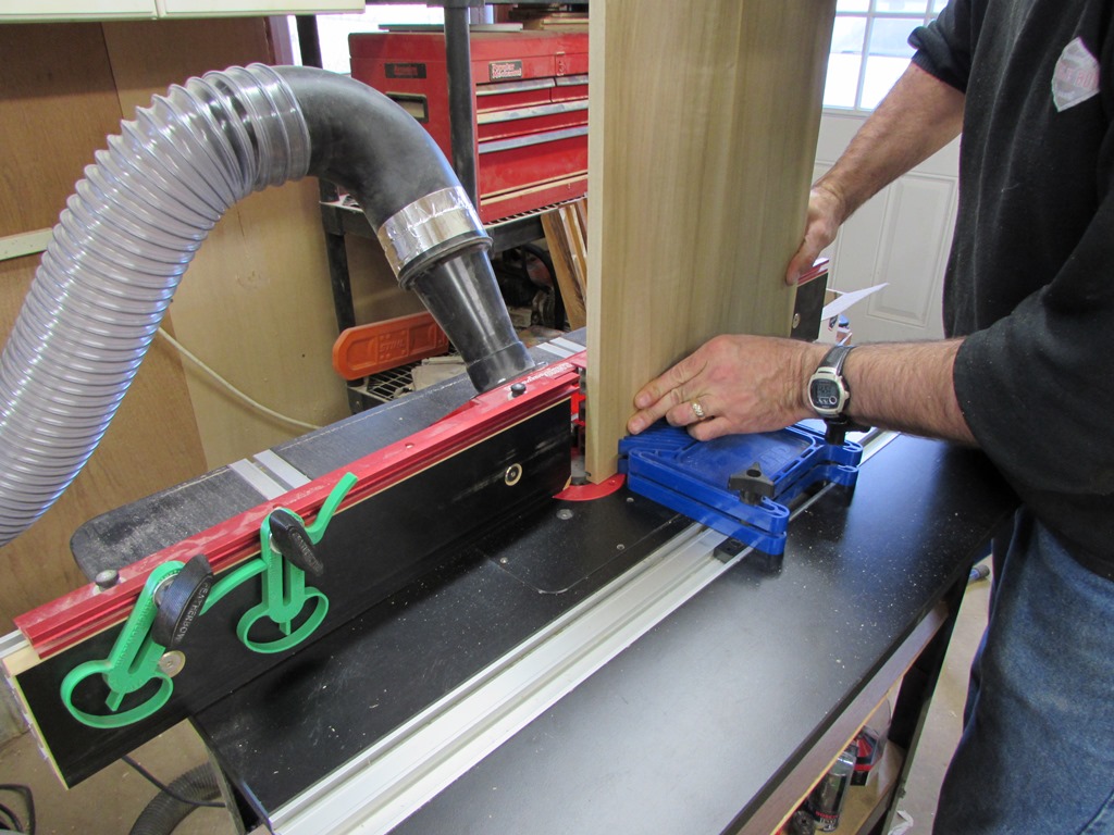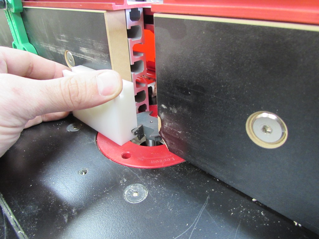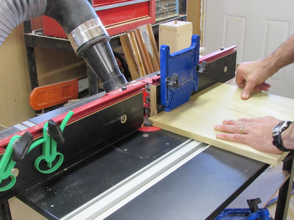 My sample cuts had a lot of tear-out when they passed by the router bit, so I fixed this problem by pushing the first piece through with the second. Once the first one was through the cutter, I flipped it around and placed it behind the second. This always kept a piece of wood behind the one being cut, avoiding all the tear-out. Please note that I had feather boards assisting in holding the work in place. I wouldn’t try juggling the pieces around, like that, if I didn’t use them.