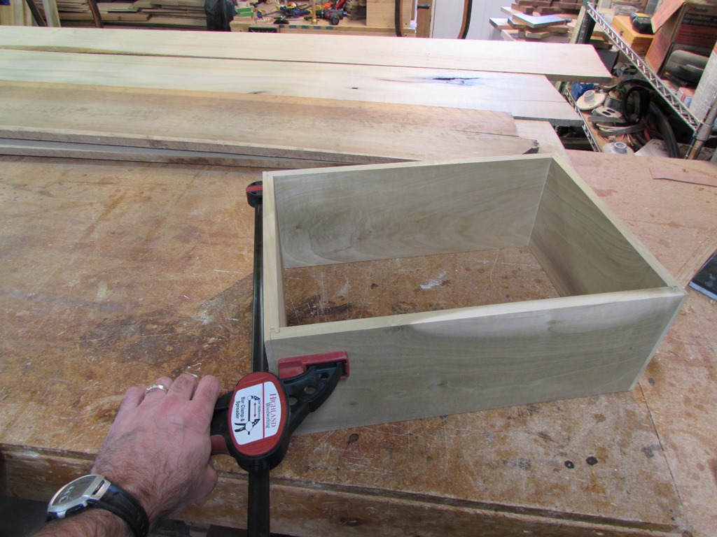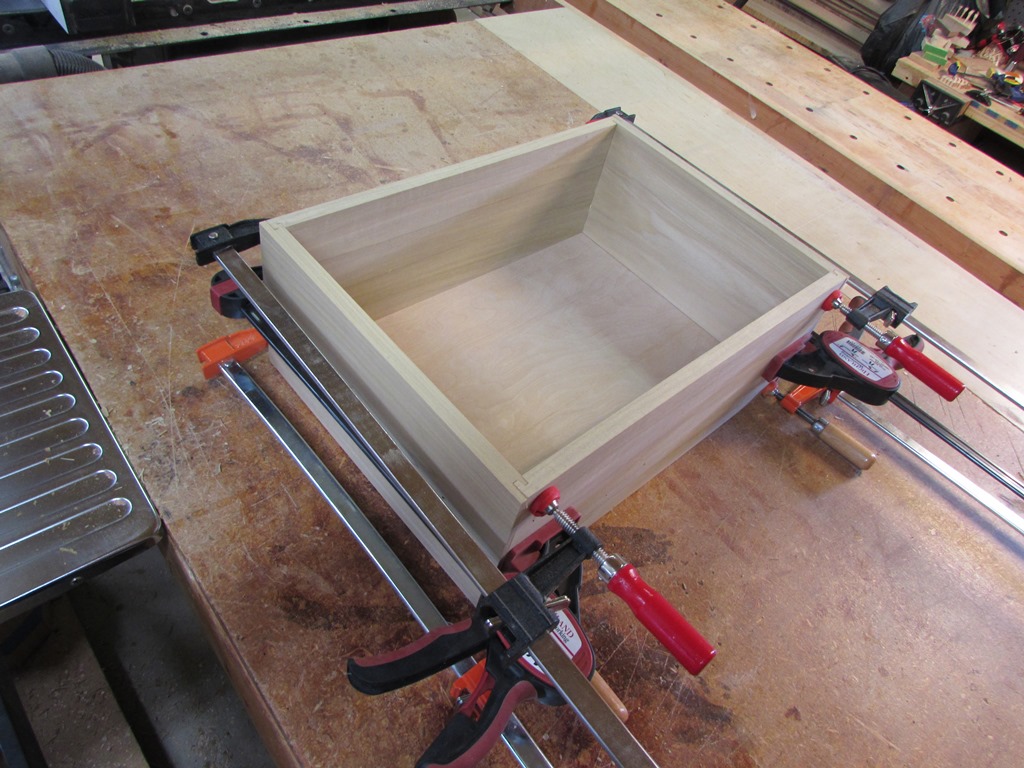 Next step is to assemble the drawers. I applied glue to the side pieces, in the groove and along the outside edges. I added the front and rear face, then inserted the bottom panel. Then I applied glue to the opposite side and pressed them all together.