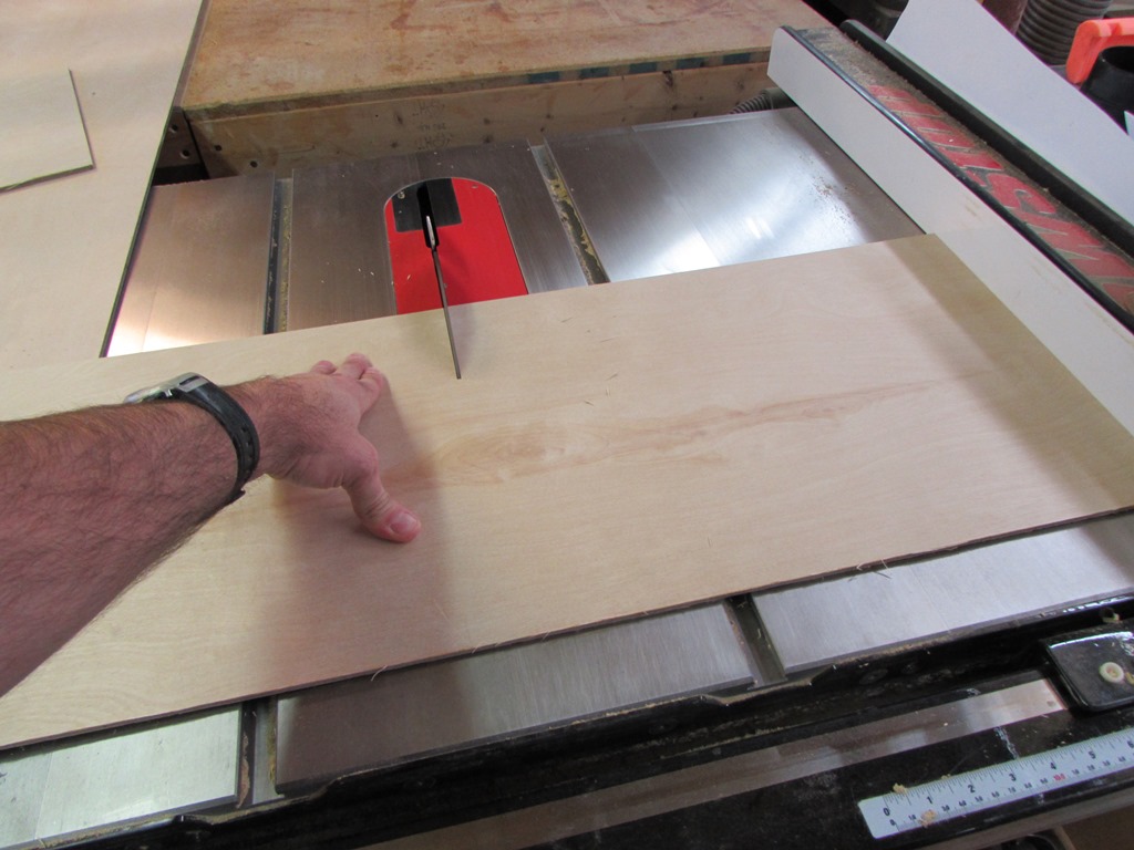 To create the slot on the bottom of the drawer, I made two passes with the table saw. This created a 1/4″ wide dado to accept the 1/4″ thick piece of plywood for the drawer bottom.