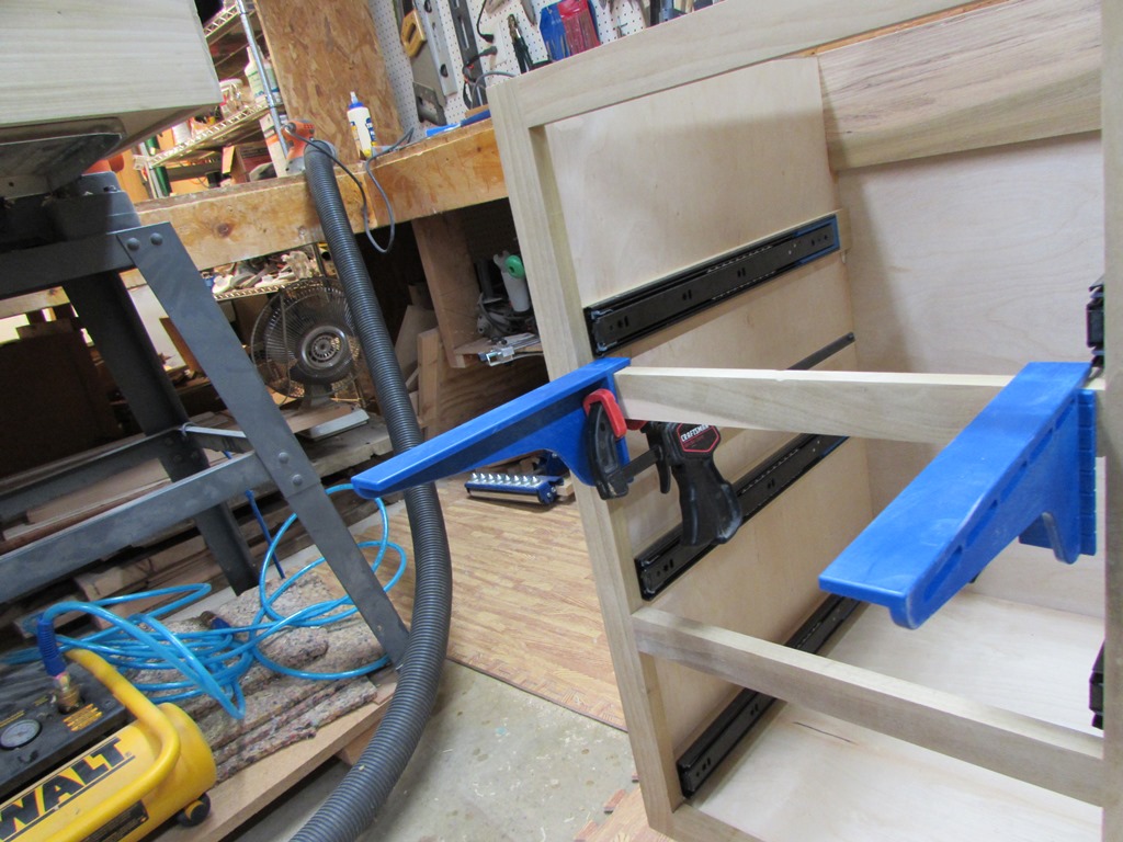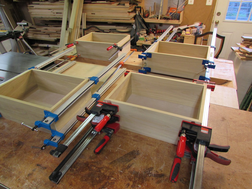 That meant I only had enough clamps for four of the drawers at a time. This slowed me down a bit, but after a half hour or so, I pulled the clamps off of the first two and glued up the last two.