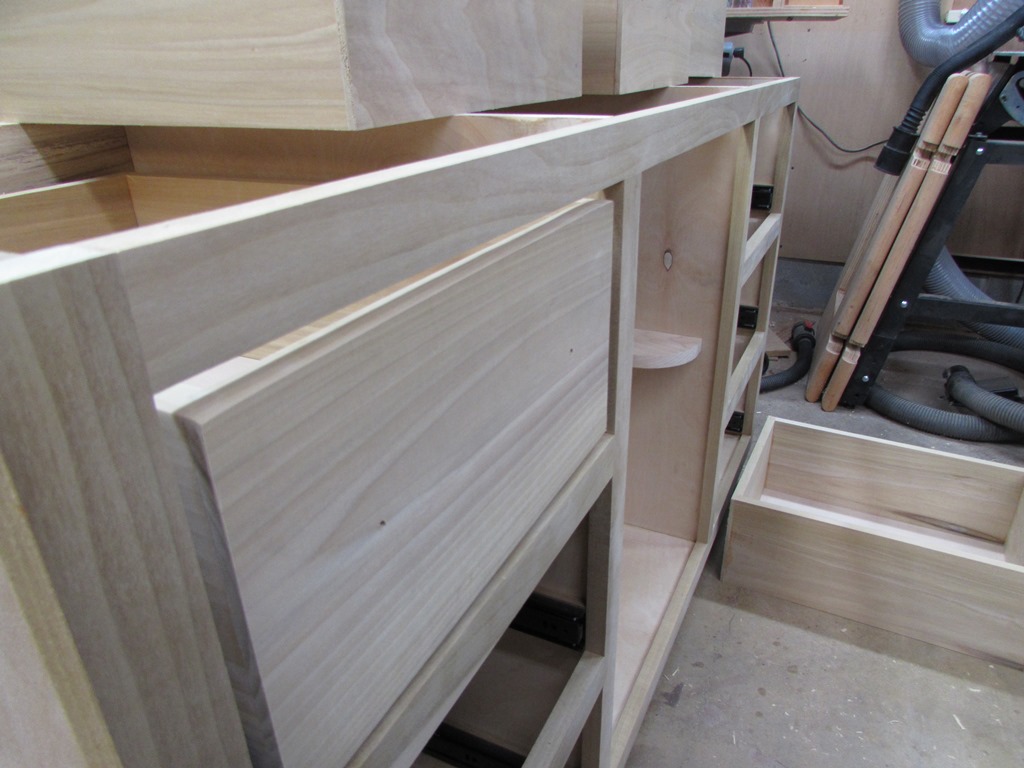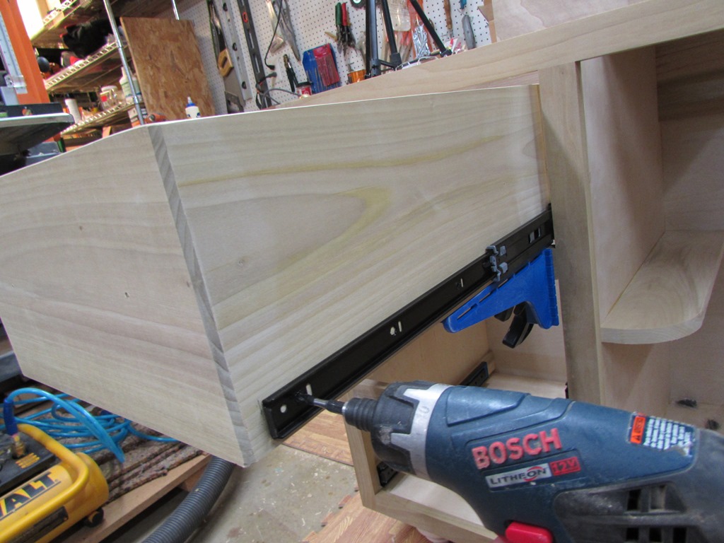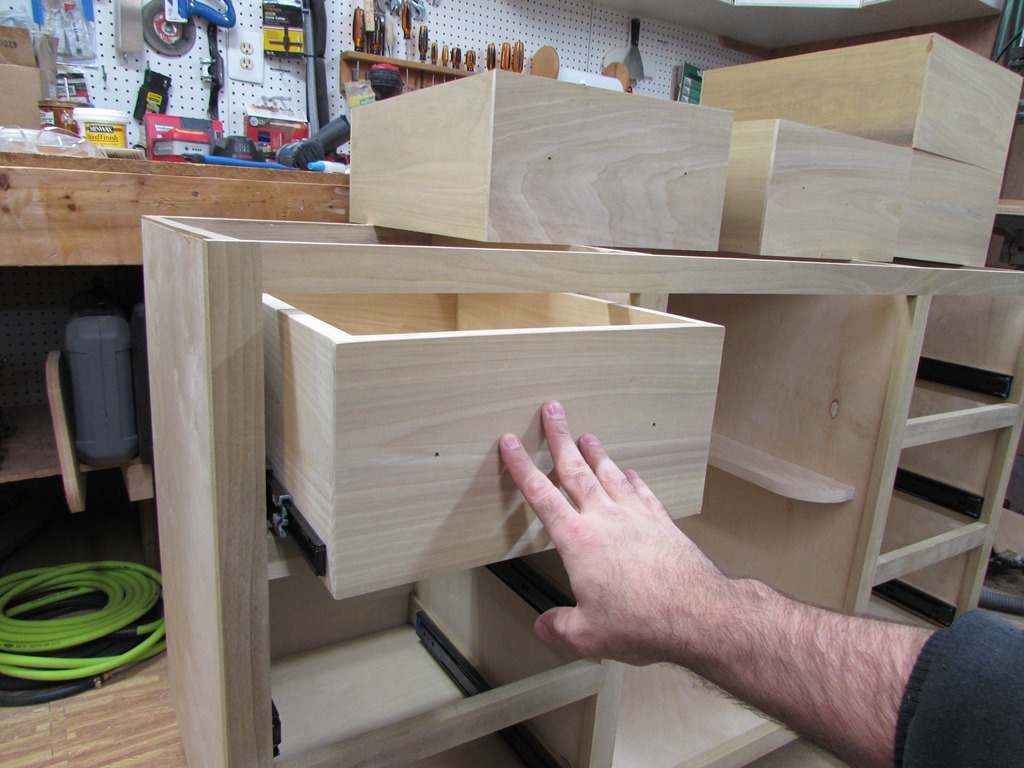 I got the first three drawers installed before I ran out of time yesterday. But they went together smoothly enough. Three more to go, then it will just be the faces and the cabinet door left to do.