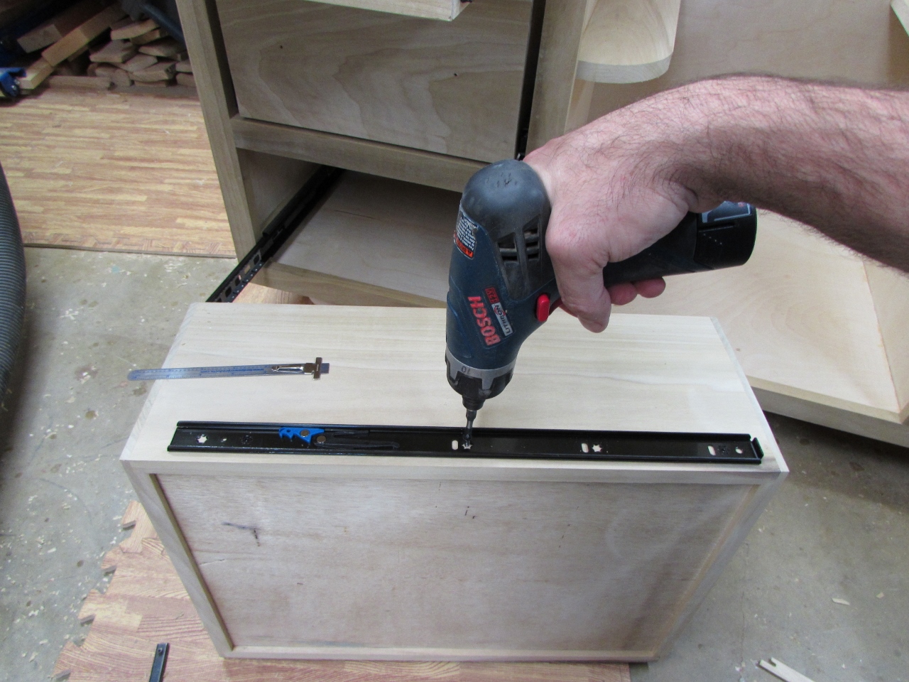 Since I already had a couple of drawers successfully installed, All I needed to do was measure the location of the slide bracket on the ones that were done, and apply those dimensions to the next drawer, while it was setting on its side. I detached the ends of the slides to locate and attach them.