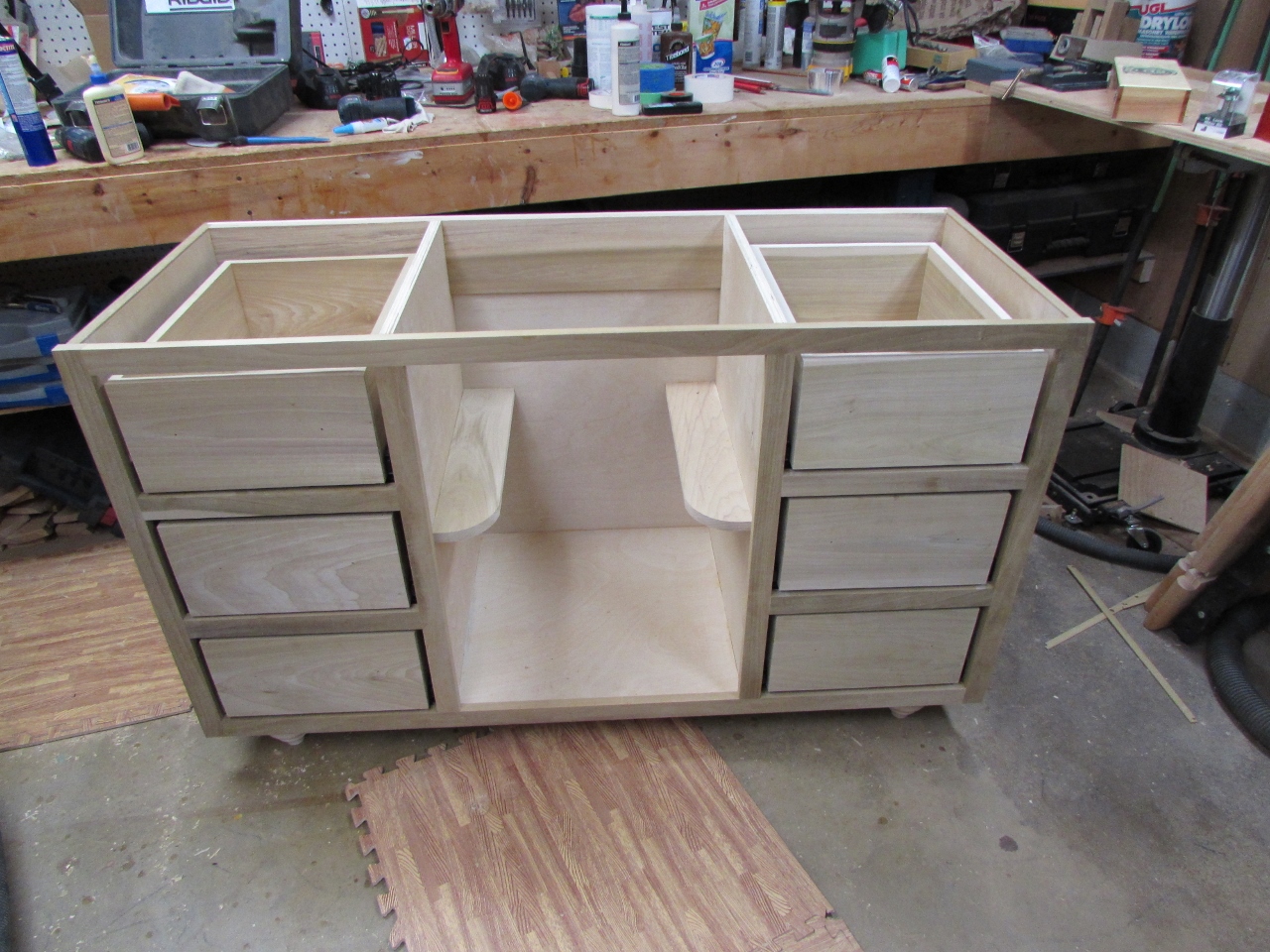I managed to find a few hours in the shop today, but I didn’t make much progress. On the last post I got three of the drawers installed. Before Installing the rest, I found that one was out of square by at least 1/8″. Since that would make the drawer face sit crooked, I made another one today. Before installing the last three drawers, I thought of an easier way than using the Kreg drawer supports that I used on the other drawers.