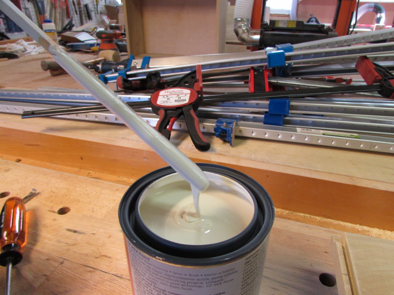The original finish, that the client wanted, was a glossy, parchment white paint. After having a conversation, last week, with the client, it is possible that the paint will change. She was looking at pictures of the vanity and really liked the grain, she wanted to know if there was a way to paint the cabinet white, but still be able to see the grain through it. I suggested that we try Milk Paint. It is a water-based paint that is supposed to be semi-transparent until you get a couple of coats on. I have never tried it before, So I bought a can of General Finishes, Antique White, and a can of glossy water-based finish.