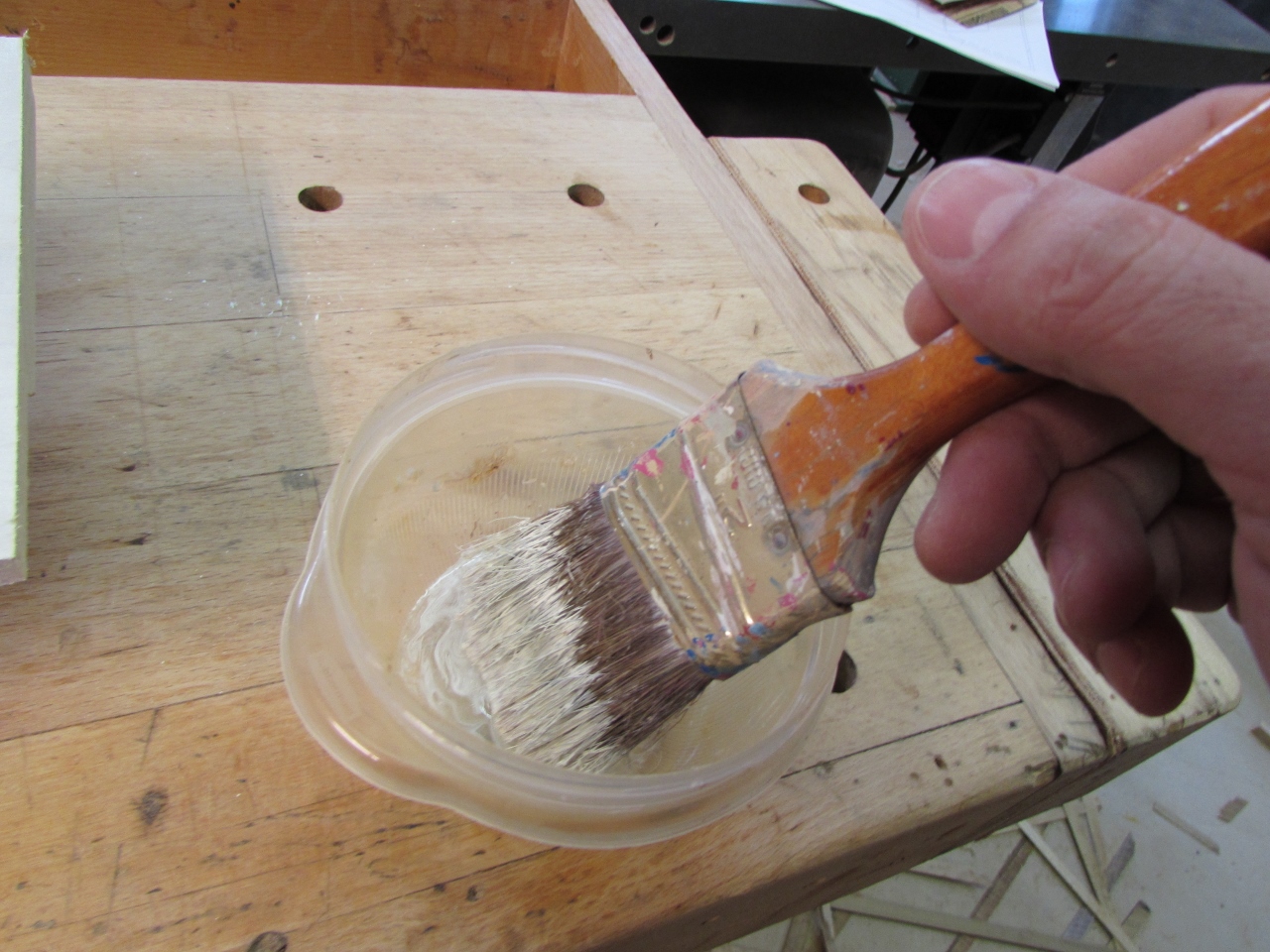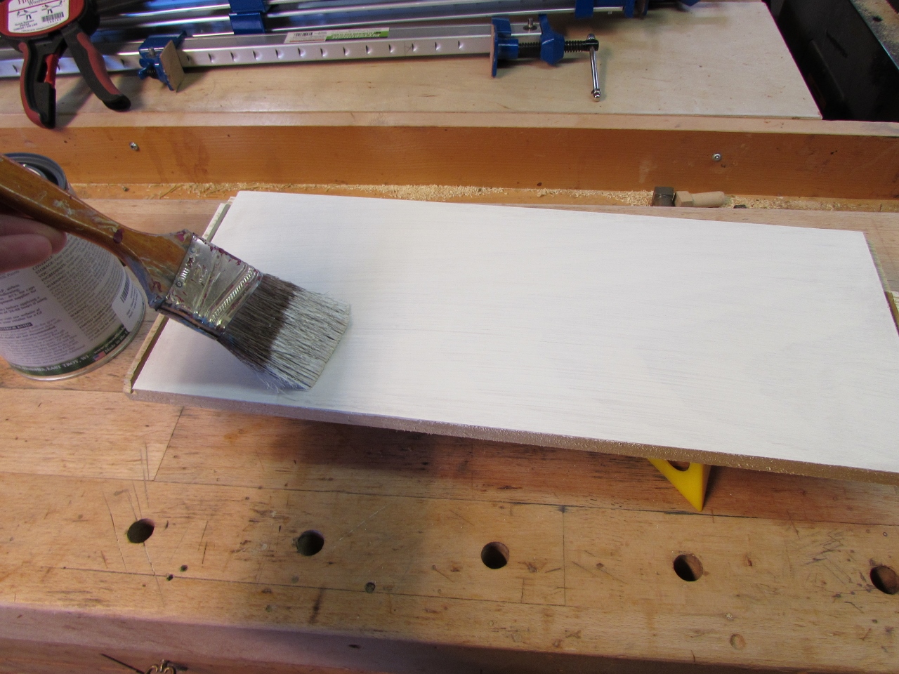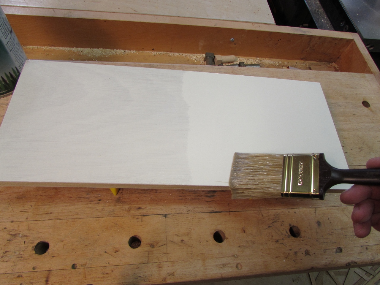 I painting both sides of one board, setting it on painter’s pyramids to dry. I dipped my brush into some water, and wiped it on one side of the board. This thinned out the already applied coat so it became slightly more transparent.