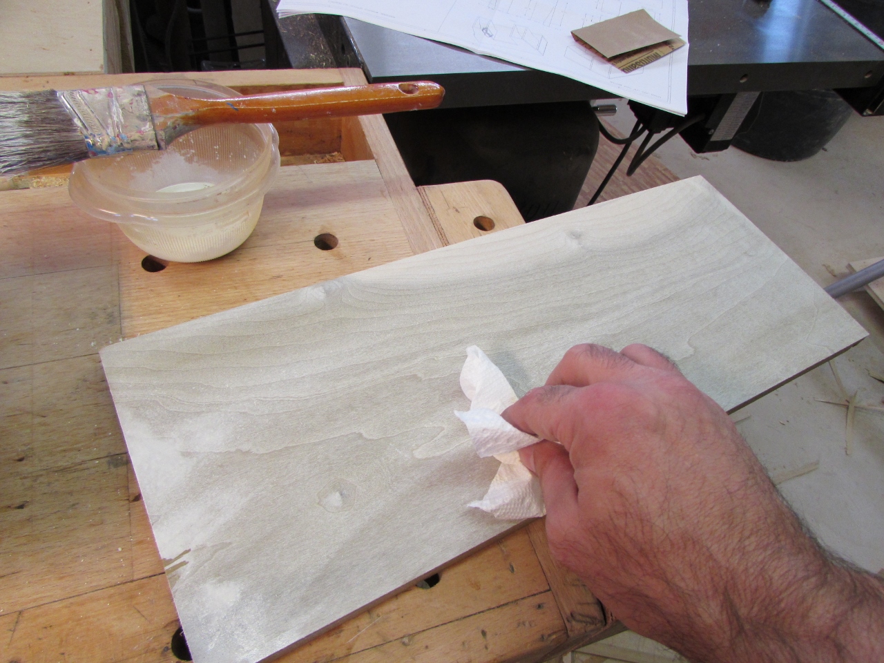 After that, I dipped my brush repeatedly in a bowl of water, then applied the severely diluted mixture to another board. It went on milky, then I wiped away the excess with a paper towel.