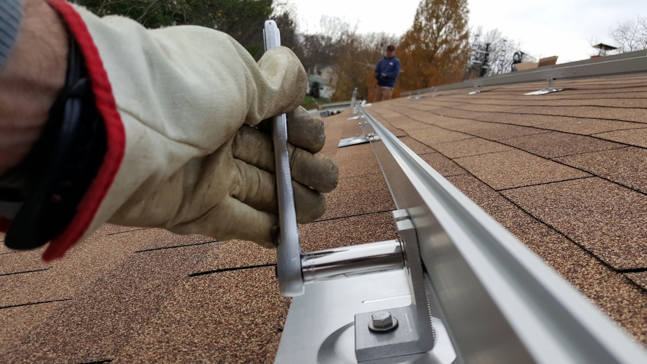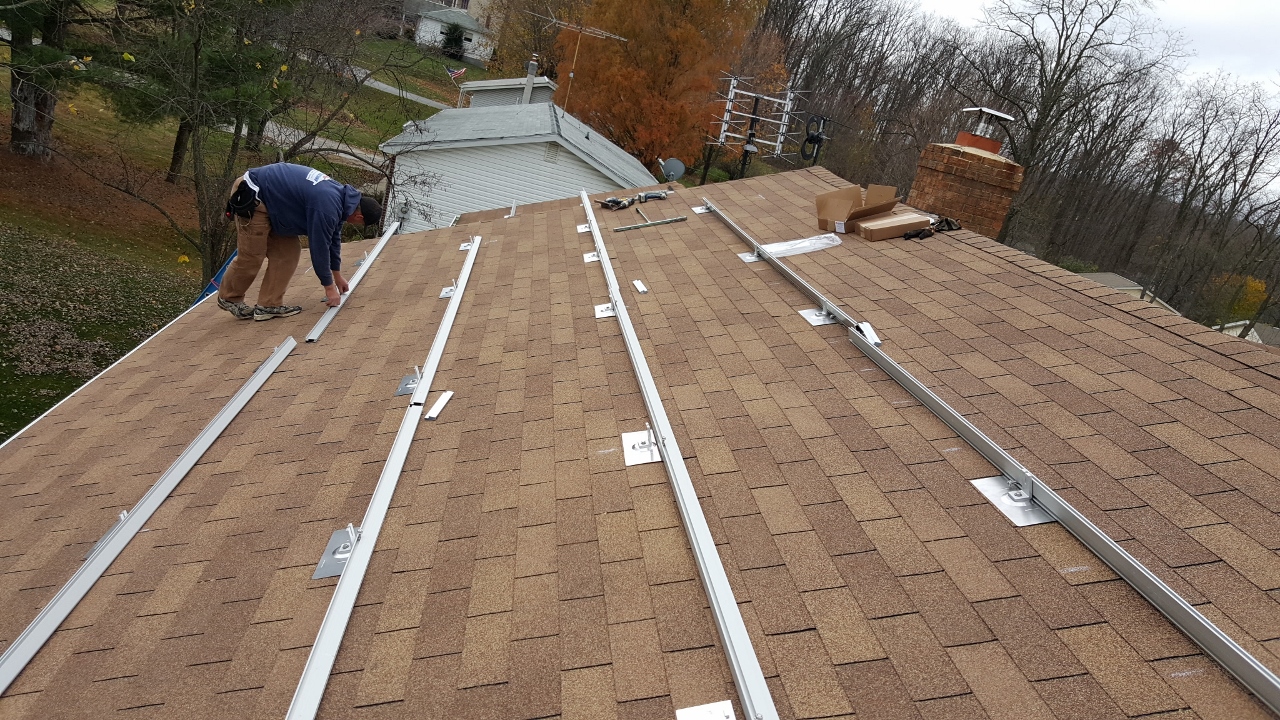 We started by installing the mounting feet for the rails. The feet consist of a large piece of flashing with a sturdy piece of angle mounted to it, along with a rubber seal. Each one gets attached to the roof by sliding under a layer of shingles, then getting bolted through the roof into a rafter with a 4″ lag bolt.