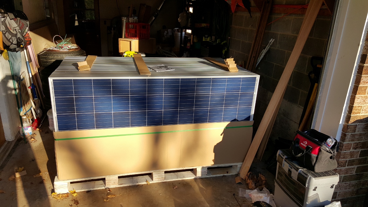 Day three we opened up the big box of solar panels. Don got 315W panels from Canadian Solar. Twenty-five of them, 33″ wide and 77″ long.