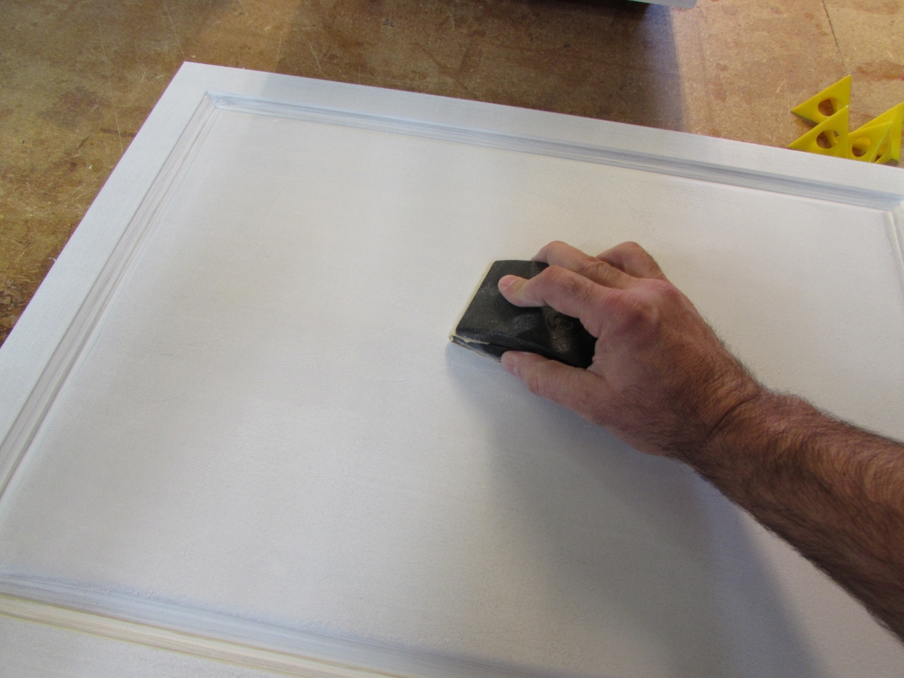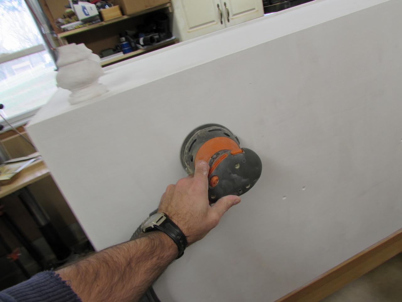 After letting everything sit drying for another day, I loaded some 220 grit paper onto my sanders and got to work sanding down the primed surfaces. This primer is excellent at sticking to the wood as well as hiding the different tones of the grain completely, but it has a somewhat blotchy appearance. It also seems to raise the grain, like a water-based finish would. This surprised me, since it is solvent based. Basically when it was dry, it was a lot more textured than I expected. I was a little disappointed. The salesman at Benjamin Moore had mentioned that I should sand the primed surfaces before painting, so that is what I did. I was surprised at how smooth the primer got with just a little sanding. It still looked a little blotchy, but it felt a lot better. Sanding and clean-up took several hours and I had to let the dust, in the air, settle before I could paint.
