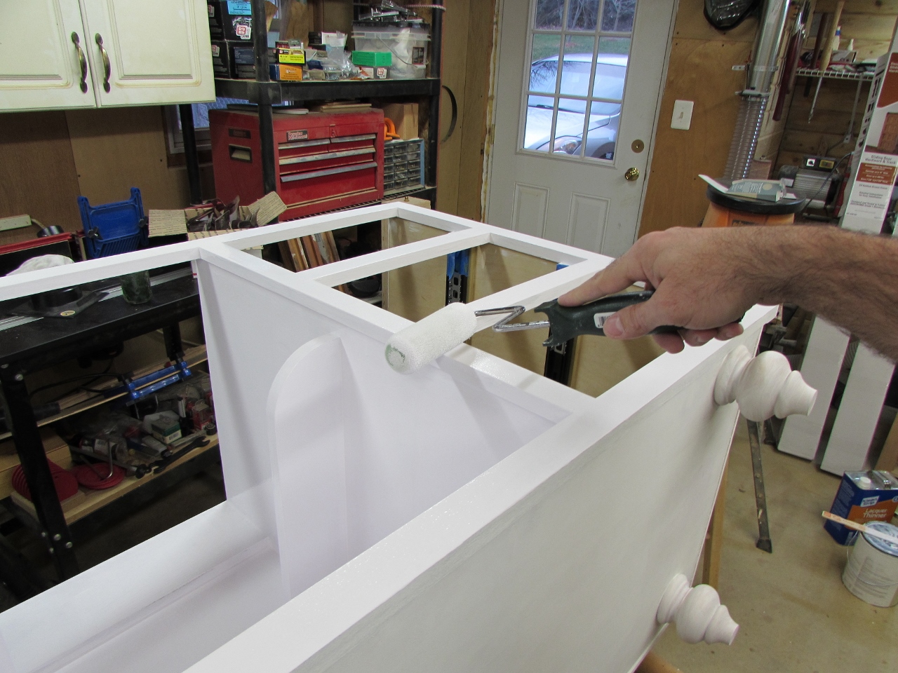 I flipped the vanity on its top, to expose the un-primed back side, then started by cutting in the edges with the brush, then moving on to the foam roller, that I found in the back of my paint cabinet.