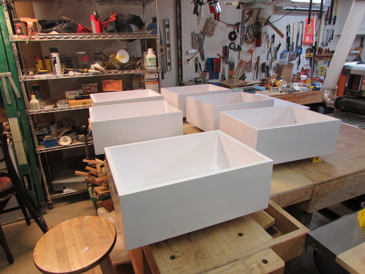 I then repeated the same process with the six drawers. I left them to dry on painter’s pyramids with their bottoms unprimed. I don’t actually think there will be a need to paint the bottoms of the drawers. They are not typically visible. I may come back to it later, but for now, I am going to ignore them…