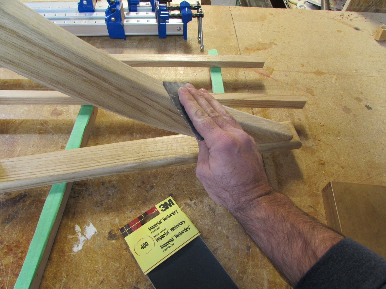 The first coat of poly has dried, so now I have to knock back all of the raised grain. I used a piece of 400 grit paper to sand back the rough stuff.