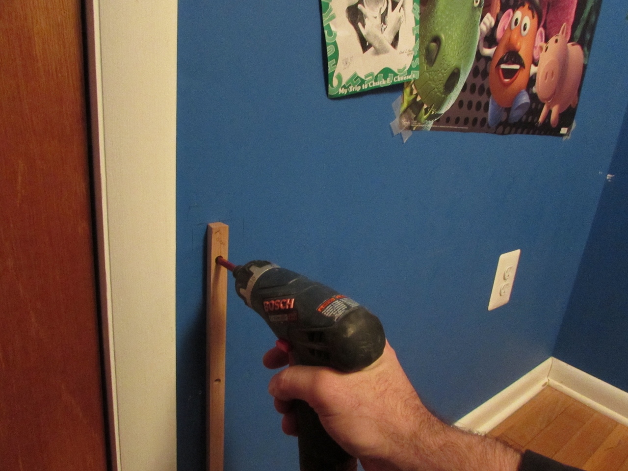 With the desk level, I attached the support strips to the wall, just below the desk top. I put one screw into each stud that the strip crossed.