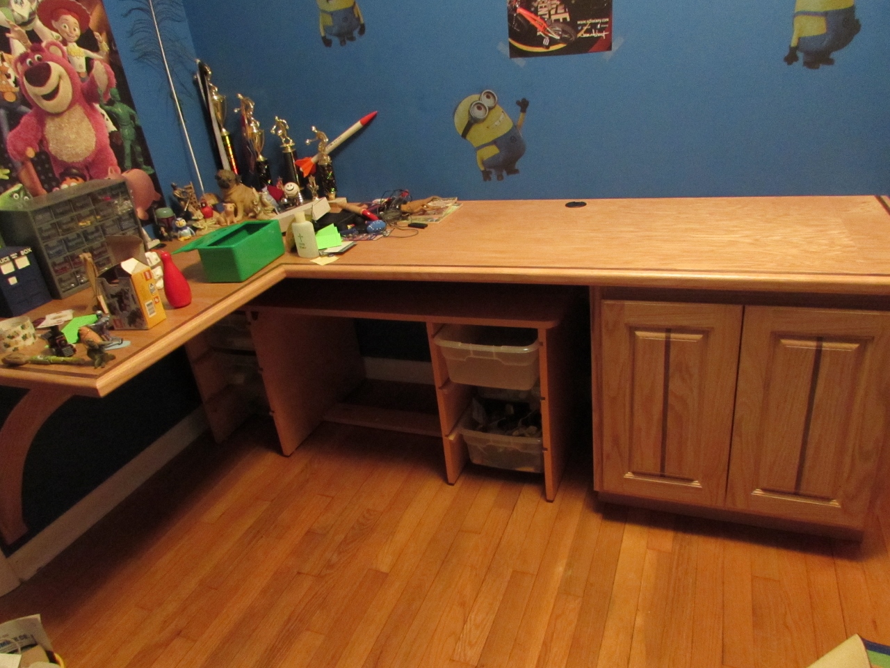 And Adam’s stuff is back! That didn’t take long… He is still cleaning his room, so he just moved the stuff that was cluttering up his old desk, over to the new one. There is actually room enough to store his old one below the new one, until he can finish emptying it, then it will be moving on.