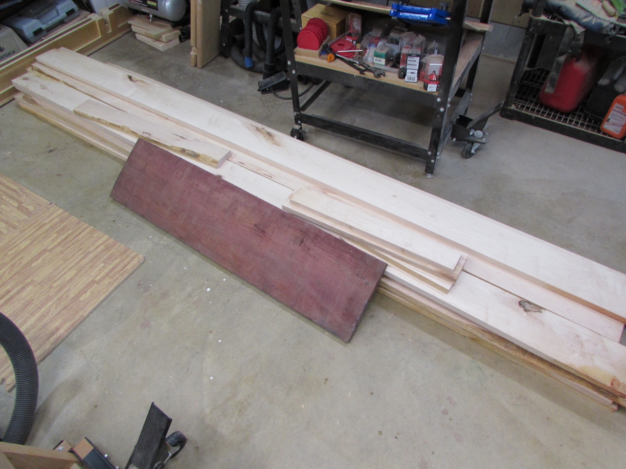 Here are the materials that I have to start with. I have some hard maple that is planed down to 1-1/16″ thick, and is 10′ long. I will be planing most of it down to 1″ for the majority of the components. The maple is not clear, there are a fair bit of knots throughout the pile. That is not really a problem because the longest piece I will need is under 5′ long. I also have a 4′ long piece of purpleheart that is also about 1-1/16″ thick. It has a bit of a crown to it, but I will be cutting a lot of narrow strips for this project, so the curve shouldn’t be a problem. The main thing I was looking for when selecting the purpleheart, was that the grain was straight. It is tough, dense wood, and a swirly grain would have a lot of tear-out on the planer.