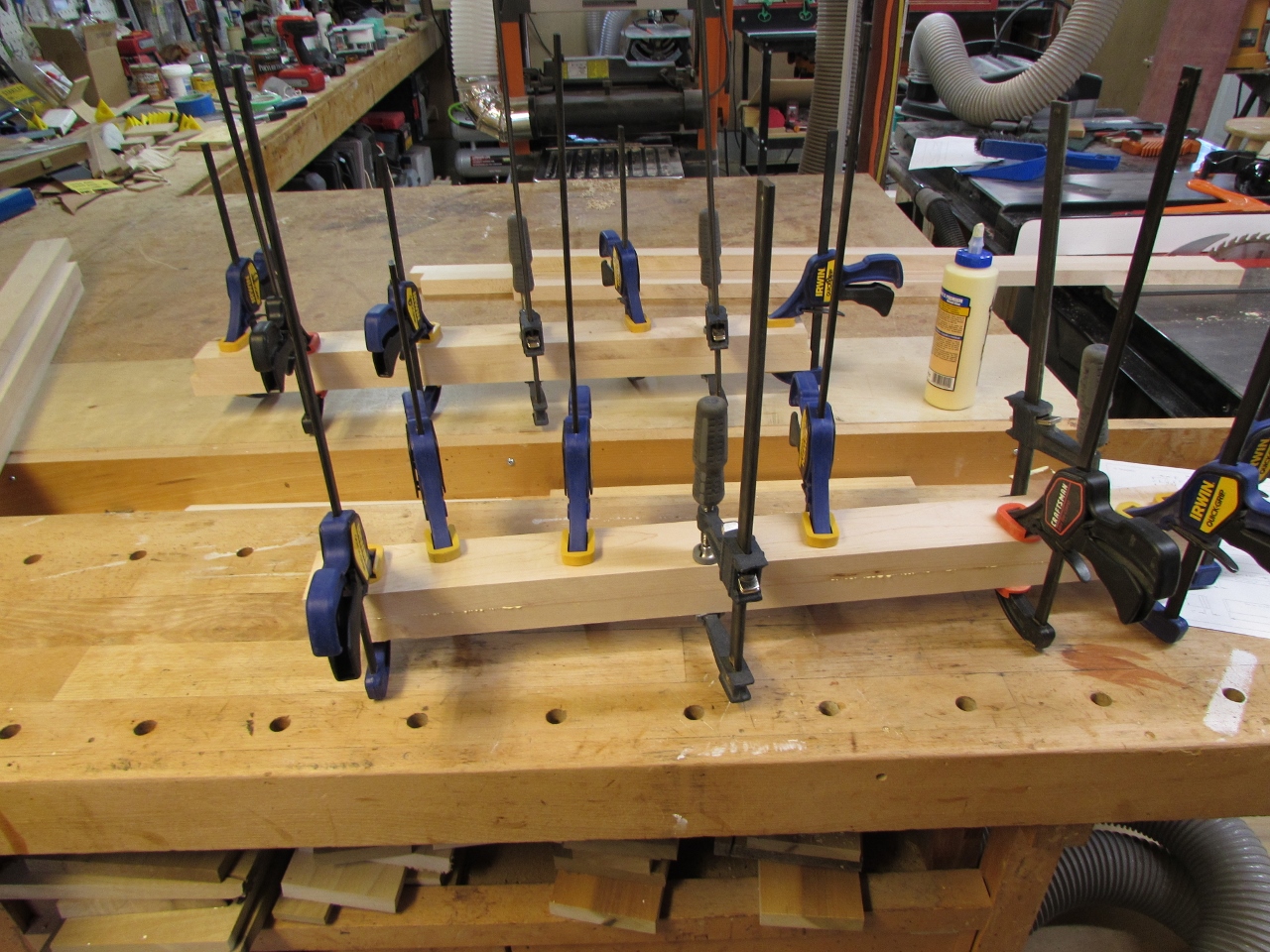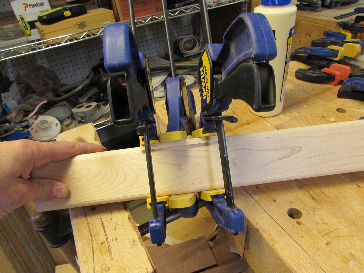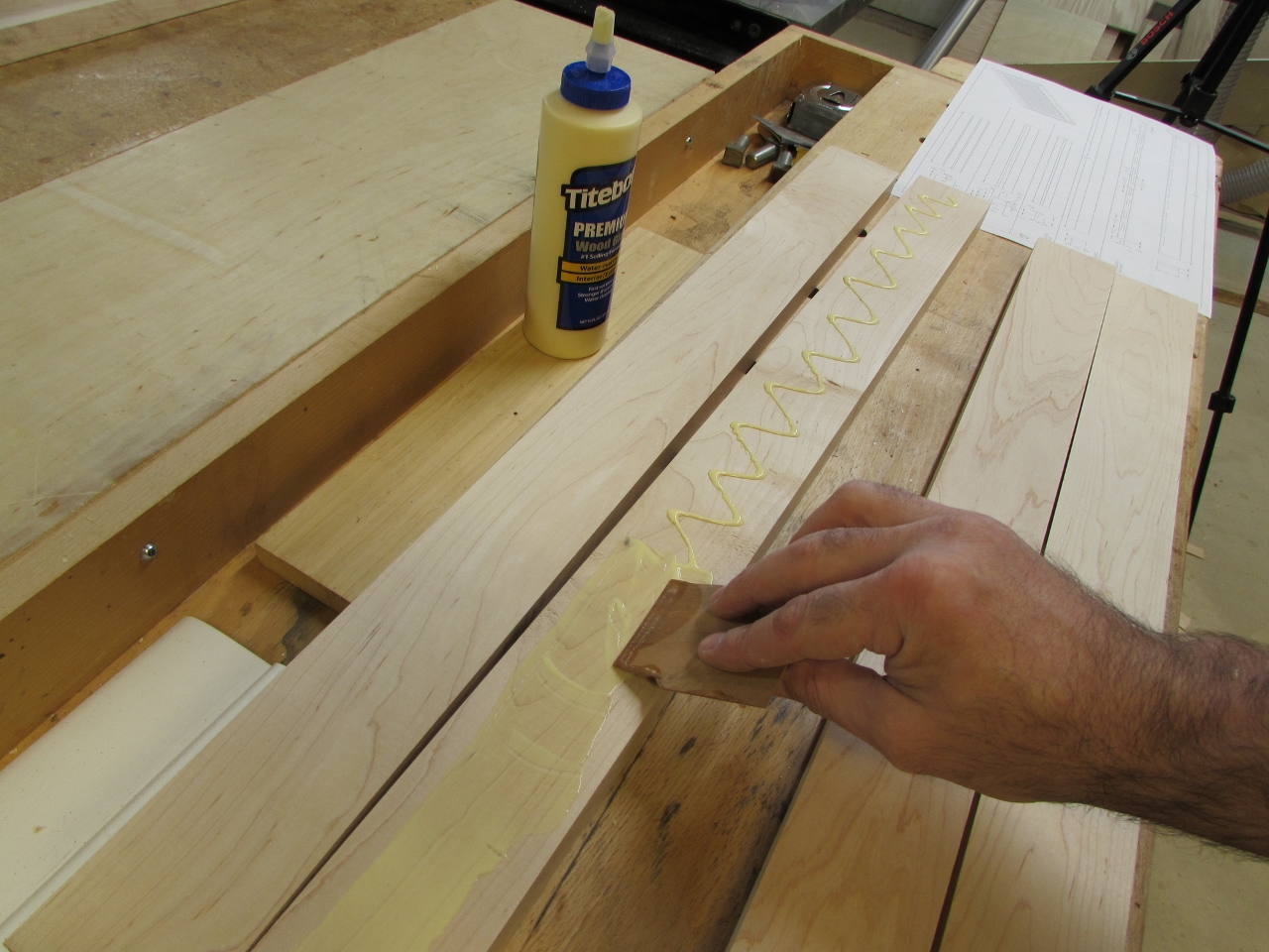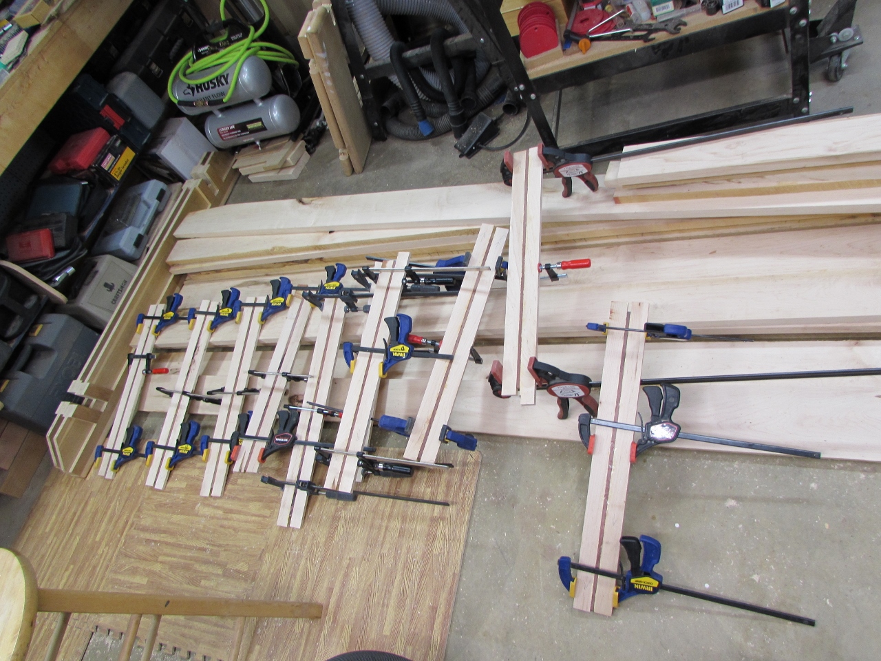 I painted the maple with wood glue, then laid it on some freezer paper and clamped it up. The paper catches all of the excess glue. I will be planing both sides of the slats so I don’t really care if the glue gets smeared around on the paper.
