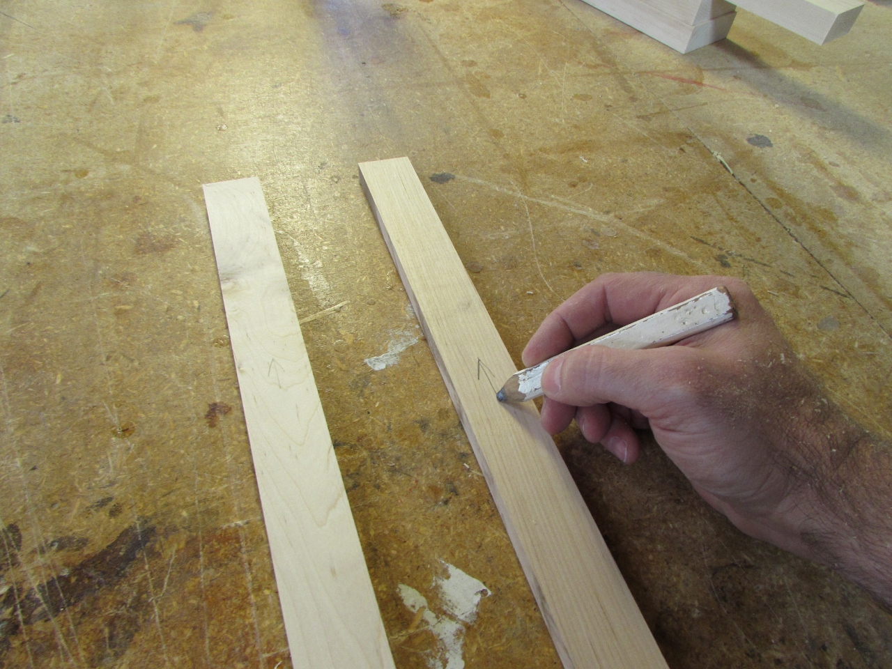 I didn’t plane them all the way down to 3/8″, I just made one or two passes to determine the grain direction. Once determined, I marked the direction, with an arrow, on each side. I will want the purpleheart to have its grain lined up in the same direction. Otherwise the joined slat would be a nightmare to plane down to size.