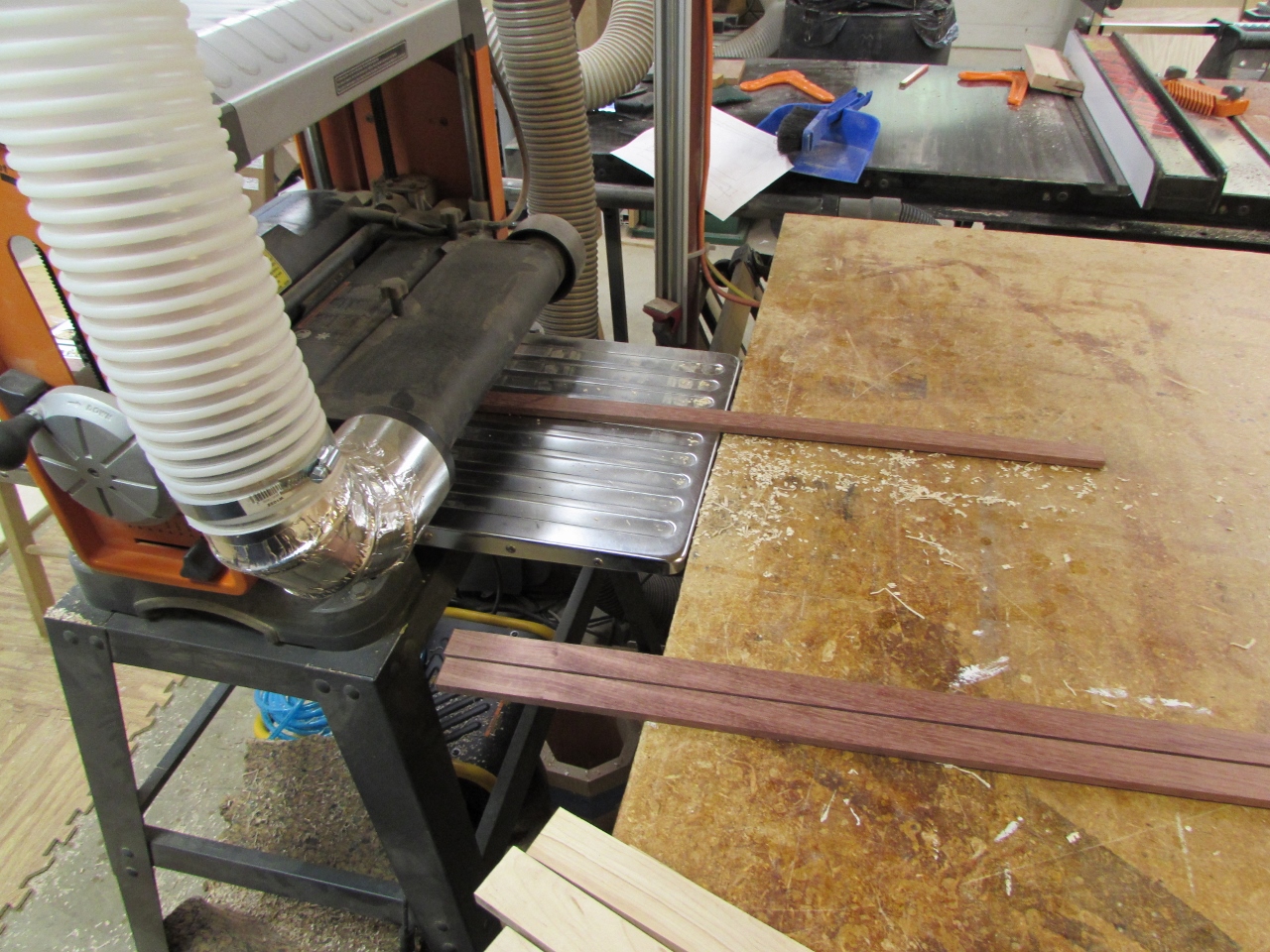 By now the slats are dry, so I pulled their clamps and fed them through the planer.
