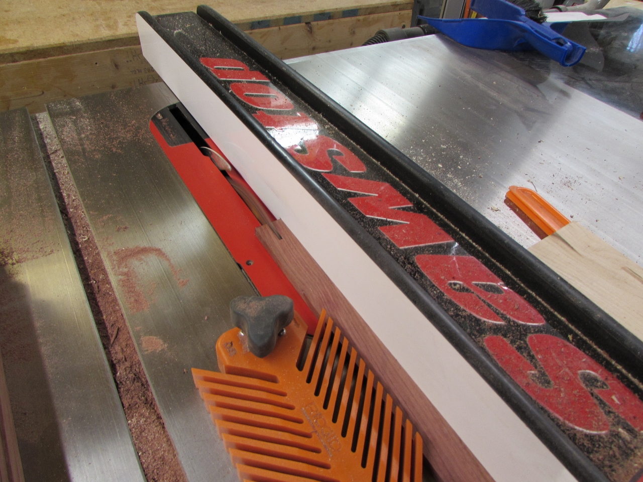 Since my slats will be 3/8″ thick, I can get two pieces easily, out of a 1″ thick piece. I set the fence and cut all my slat pieces in half. They got a little burned by the saw blade, but the clean up easy enough when you run them through the planer.