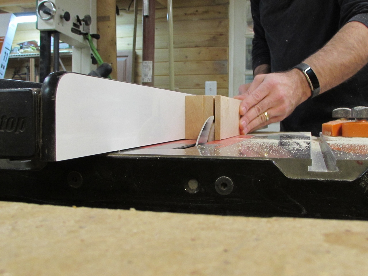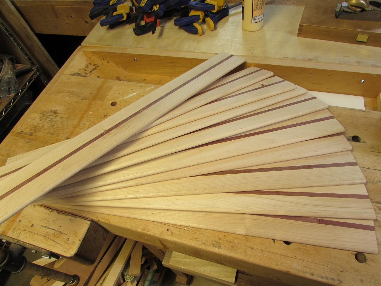 After cutting out the rest of the pieces, I went through my off-cuts and pulled out any boards that were at least 2′ long and 1-1/2″ wide. These will become the sides of the slats. I really like the appearance of the purple stripe running through the center of the slat. I came up with the idea originally to use the scrap wood. Maple is hard and re-sawing maple can be difficult. Since most of my off-cuts are thinner, I figured It would be way easier to resaw 1-1/2″ thick wood, rather than 3″ wide wood. It also saves wood since the thinner off-cuts would probably have gone on the burn-pile instead.