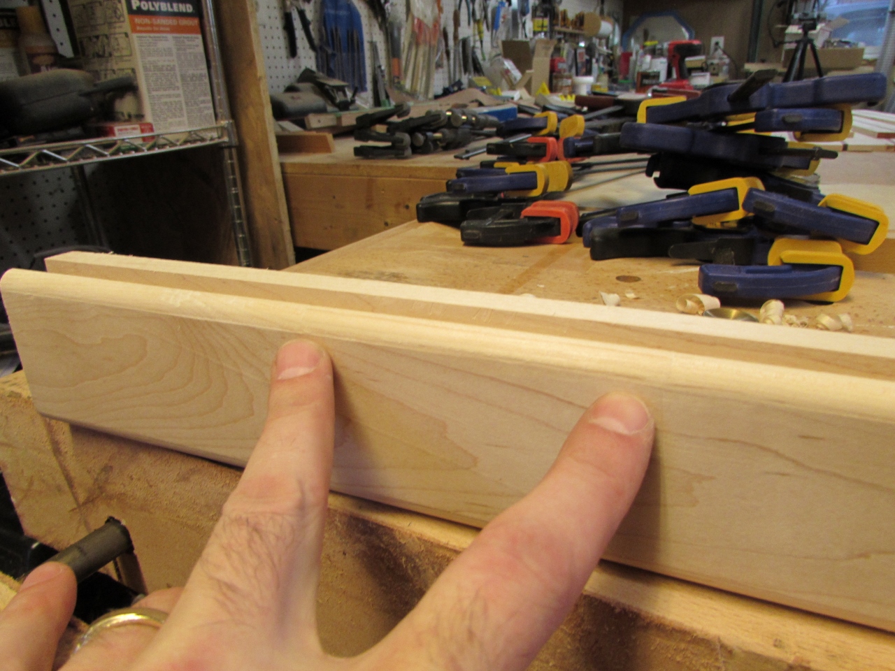 I glued and clamped the patch in place. When it was dry, I planed the two protruding surfaces down flush, and ran the 1/4″ round-over bit across the spot again.