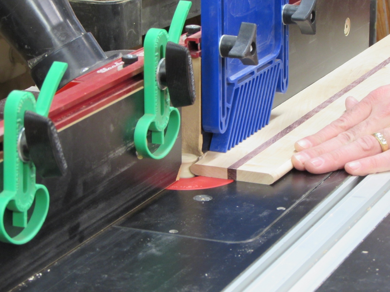 With the maple parts done, I cut off a piece of purpleheart, that I ripped into 1/2″ wide strips.