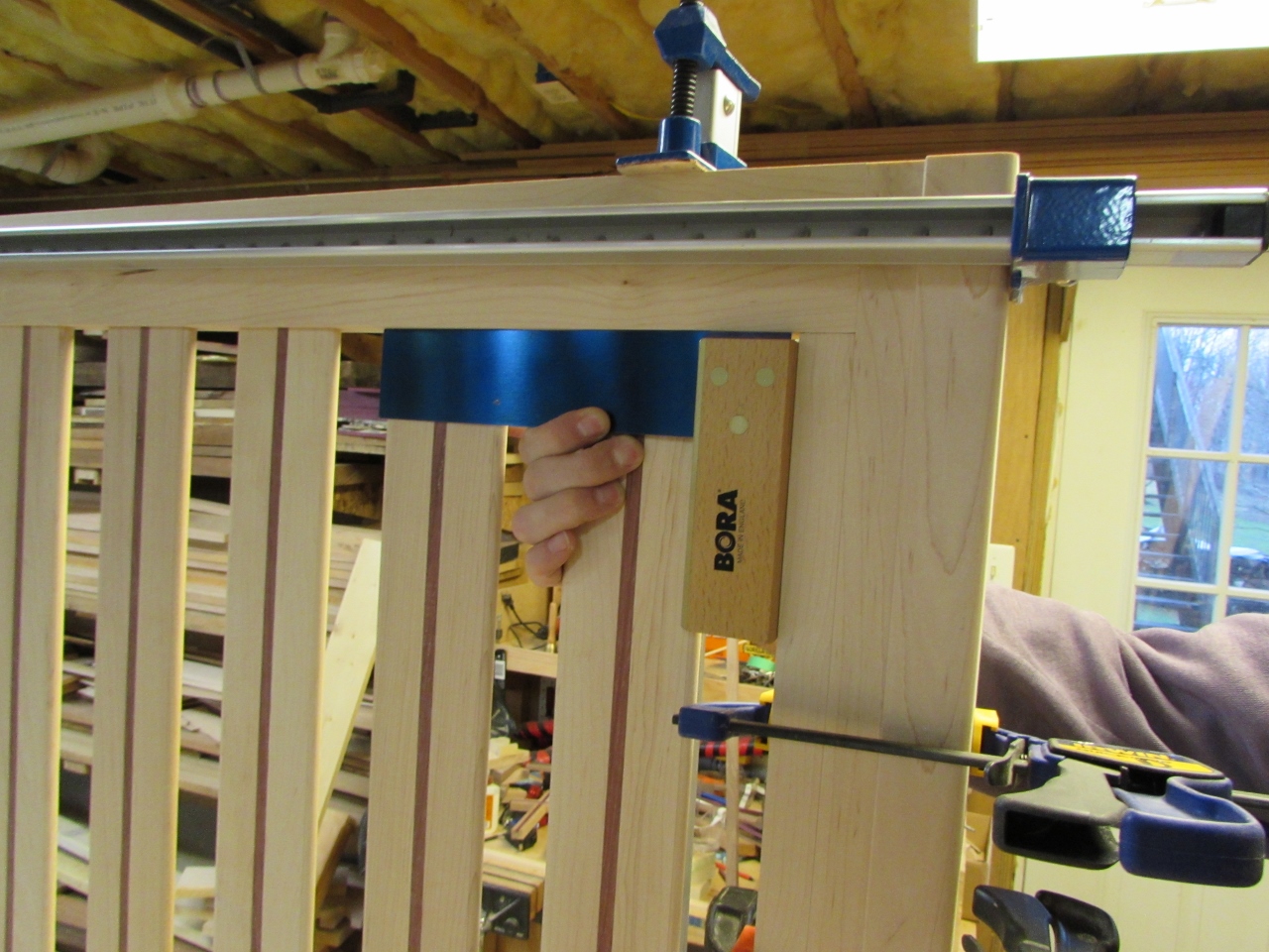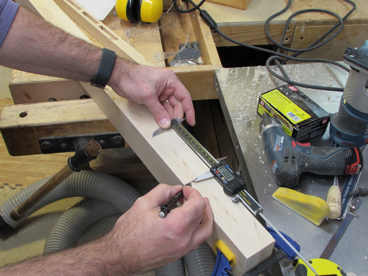 I racked my brains last night, trying to come up with a clever way to repeat the spacing for the slots. Then I realized that it wasn’t necessary. If I was making a dozen cribs, then repeatability would make sense, But this is just one crib. I only needed to take the time and lay out the slots. I clamped both boards together and Laid out the marks as exactly as I could, using my digital calipers.