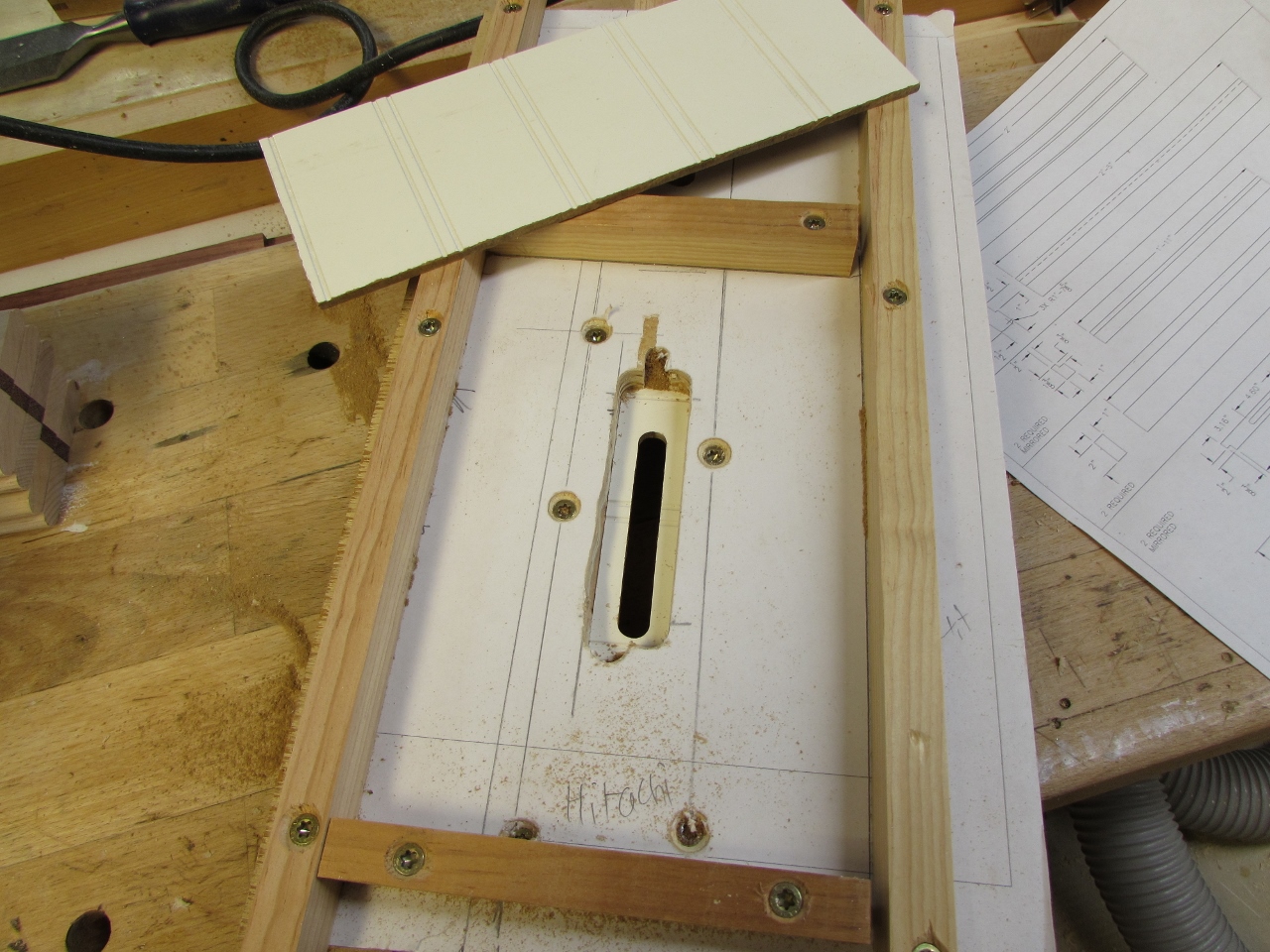 I remembered to adjust the cutter to compensate for adding the hardboard, and cut the slots of my bottom rail. I noticed that the slot wasn’t quite large enough when I tested the first couple. That was when I realized that my own saw dust was getting jammed between the router base and the sides of the jig. I simply cleaned it out and ran the router around again.