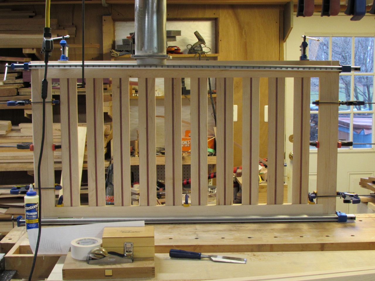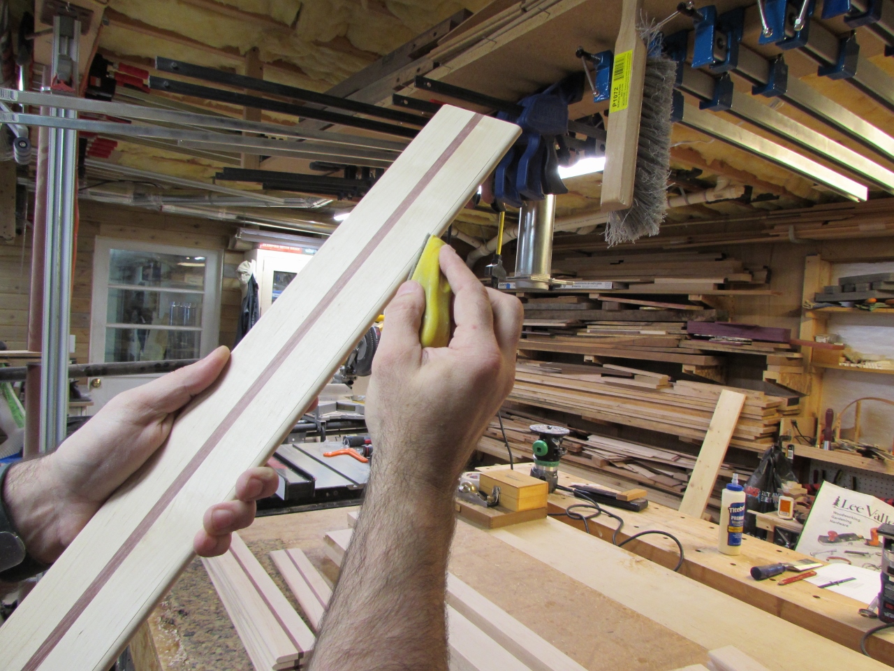 When the main body was dry enough, I pulled the clamps and applied a layer of glue on the top and bottom of the rails. Next I clamped a couple of long, flat strips to the inside face so the top and bottom caps would set flush to the inside. Then I clamped the caps in place.