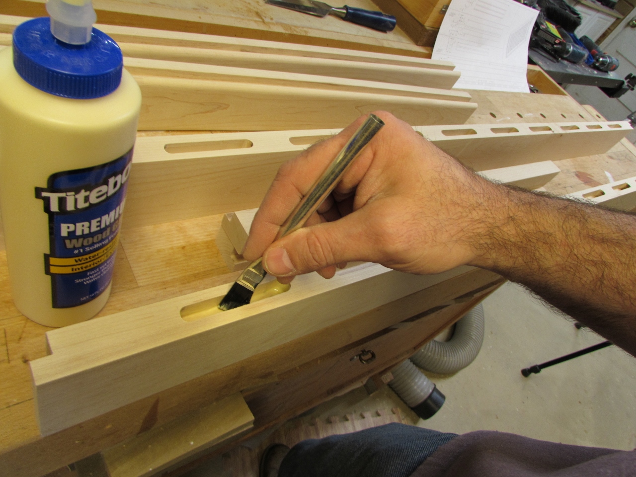 With a brush, I applied a thin layer of glue to all of the slots on the top and bottom rails, as well as in the dados on the side pieces.
