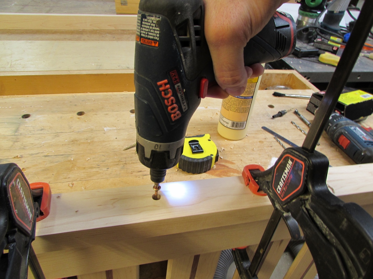 I am sure the glue will hold the caps on, but to be on the safe side, I am screwing them on as well. I pre-drilled and counter-sunk five evenly spaced holes along the top and bottom surfaces.