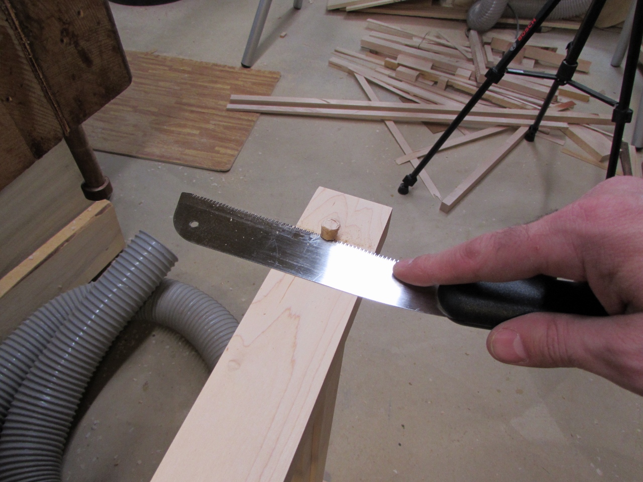 To fill those holes, I grabbed an off-cut with a similar grain to the caps. I set up my 3/8″ plug cutter in the drill press and made a dozen or so plugs. I cut the plugs free with a single cut on the band saw.