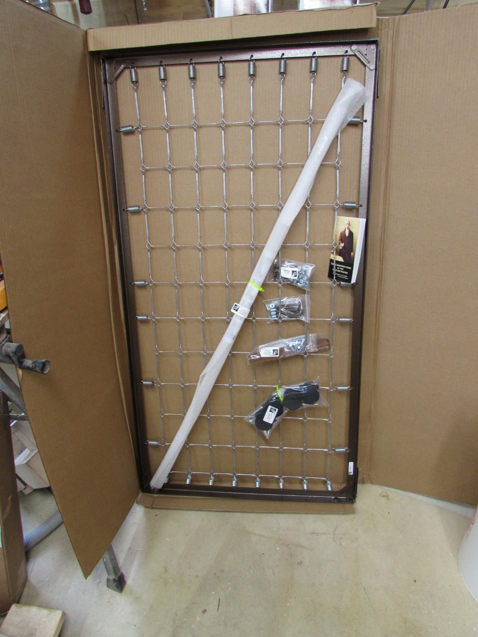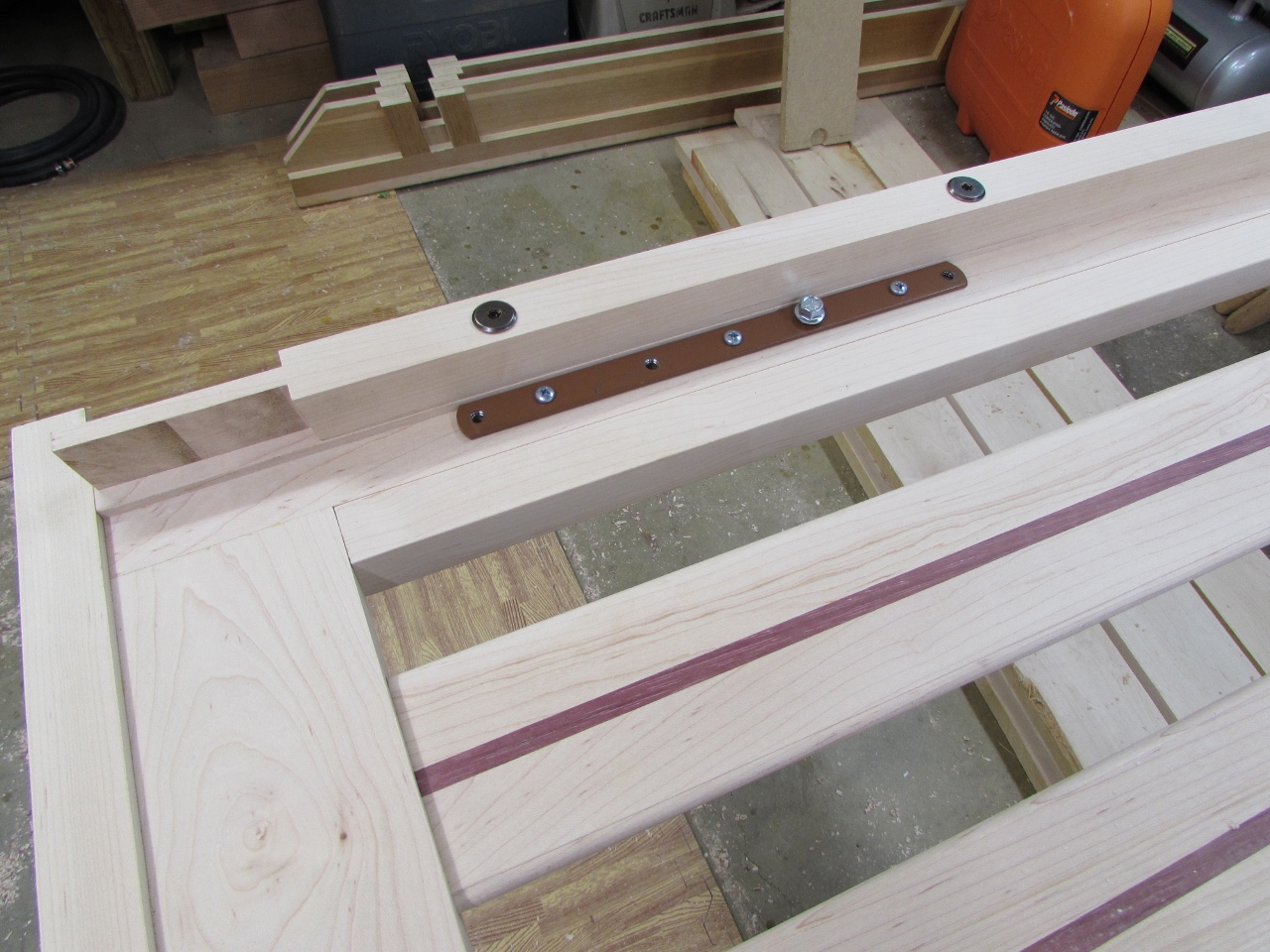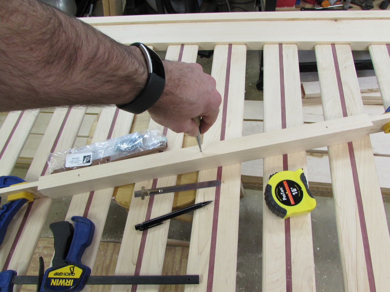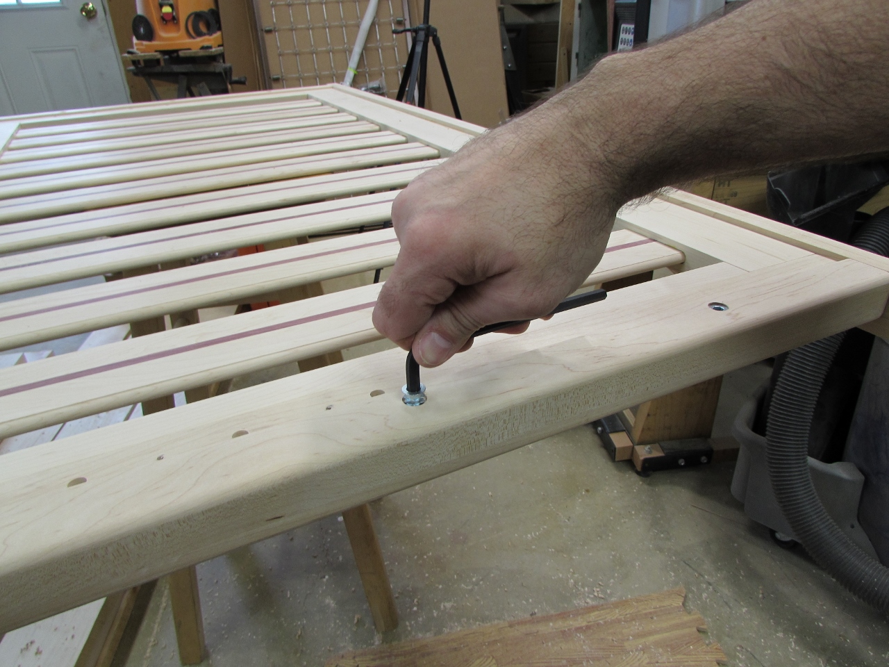 Before I can finish up with the sides, I need to locate and mount some hardware. I decided to buy a mattress spring frame, as opposed to building a frame, because I thought it would be easier for a single person to adjust. All the adjustable wood frames I was coming up with, seemed like they would be awkward and probably require two people. After a bit of searching, on the web, I found there was a limited selection available. The best option seemed to be from Products America. I think the frame alone was about $80. It was $100 for the kit, so I opted for that. The kit contained bolts and inserts, teething rail caps, wheels, the bed frame, adjustment brackets, and a pocket US constitution. I think they take their “Made in America” products very seriously.