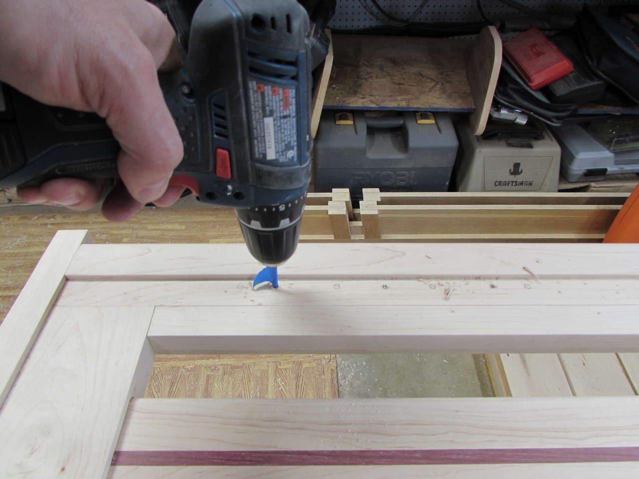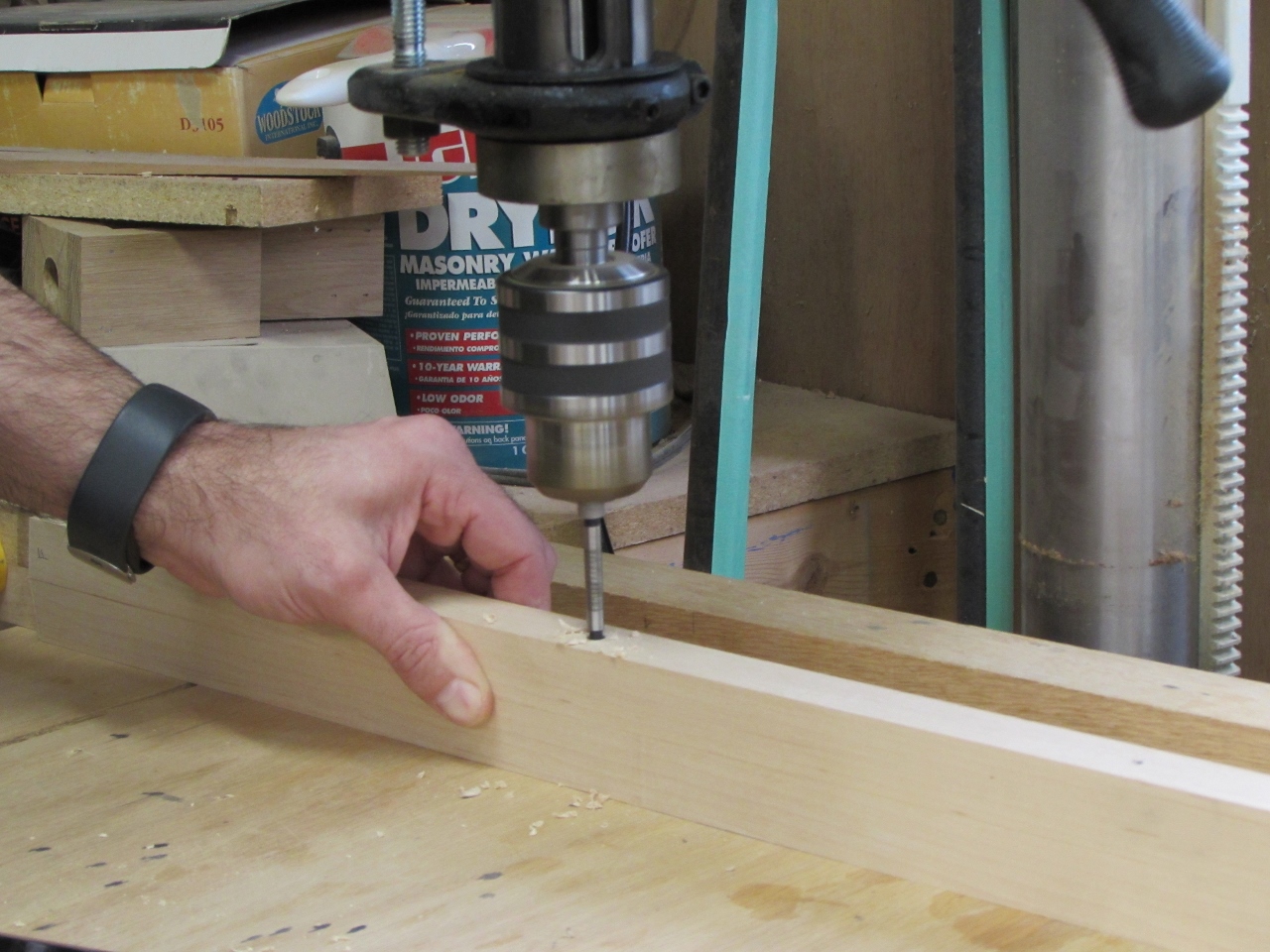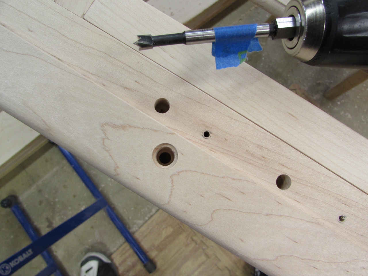 Then I moved to the outside rail and drilled a 1/2″ hole about 1/16″ deep to recess the rim of the insert. Using the center point, I stepped down to a 3/8″ bit and drilled about 1/2″ deep to create the hole for the insert. Finally, I drilled a 1/4″ diameter hole as clearance for the bolts. I made sure to mark the depth of them as well.