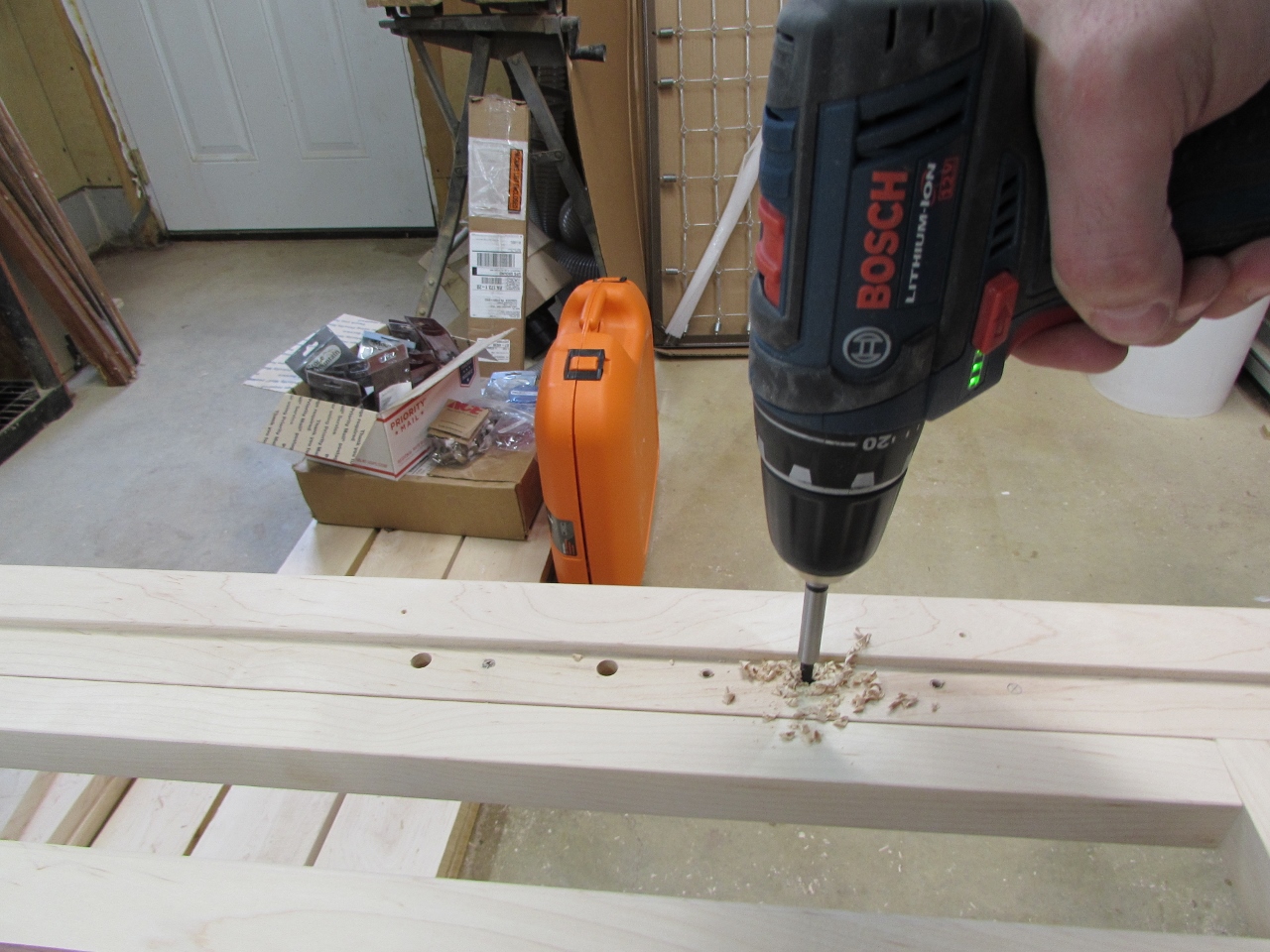 Next, I used a 5/16″ bit to make the clearance holes for the adjustment bolt, at all four locations.