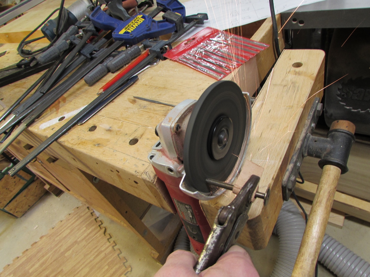 I normally cut my bolts down, in a vice, with a hacksaw, but these bolts have such a nice oiled bronze finish, that I didn’t want to scratch them in the vice. Hmm, perhaps it was a bit over-kill, but I clamped my angle grinder in a vice and plugged it in. Instant grinding wheel. I wrapped a piece of leather around the bolt, and clamped my vice grips tightly around them, then ground away about 3/16″ off the tip.