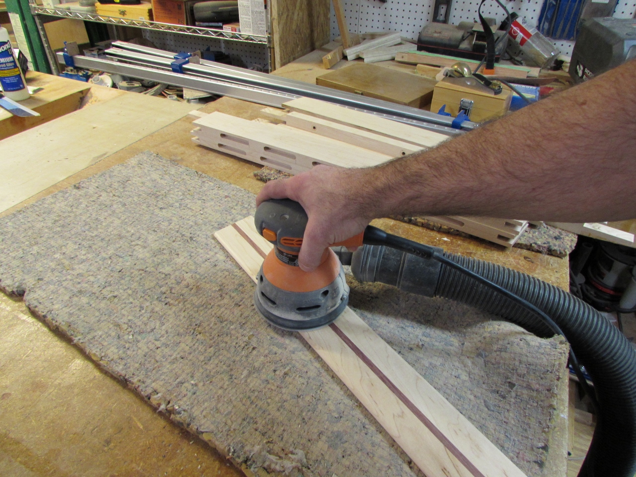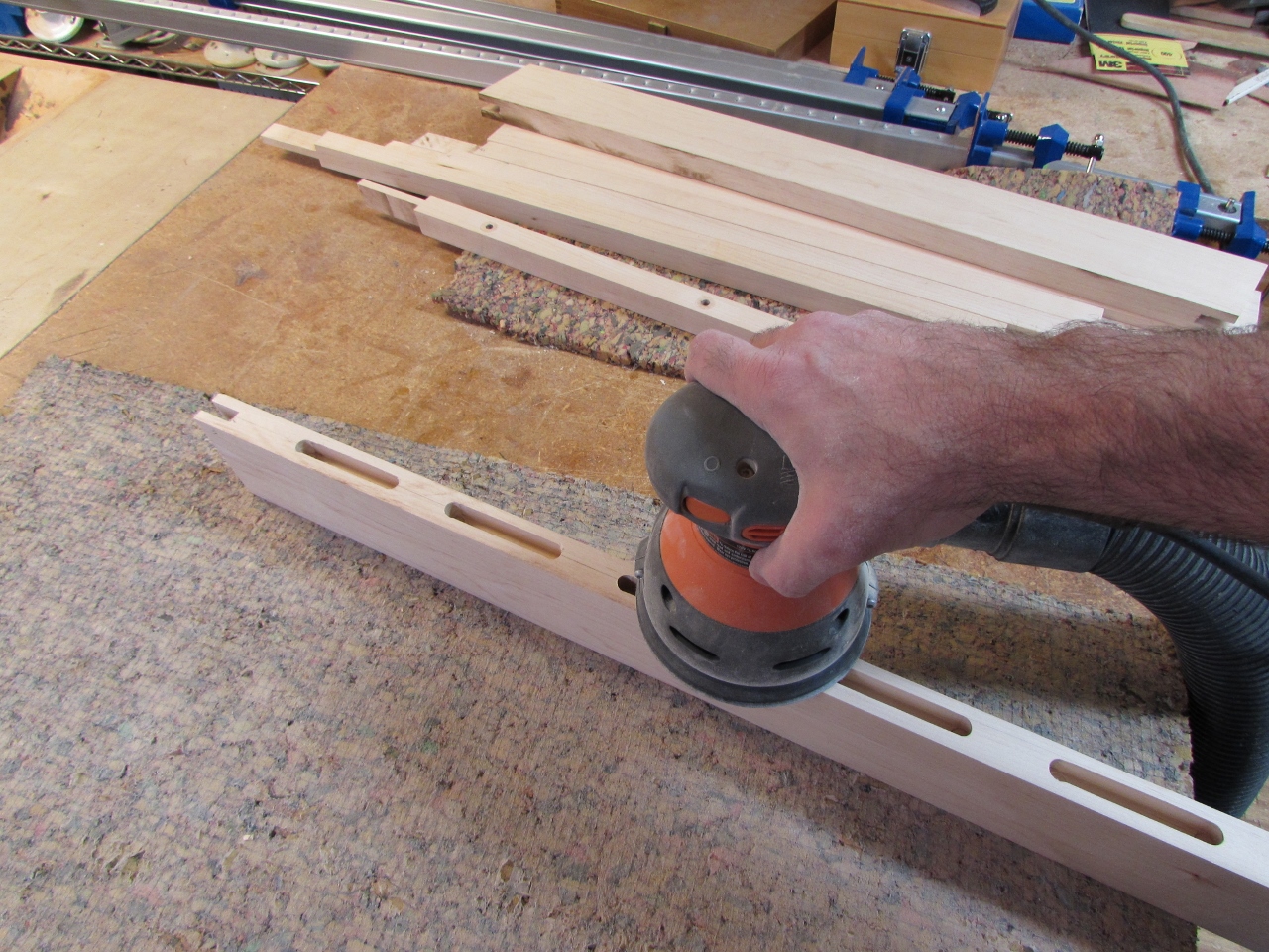 I almost forgot the top and bottom rails. They were still on the table saw. I planed them down and sanded them as well. Then I cut the two bottom ones off square, and applied the required 8 degree angle to the top rails.