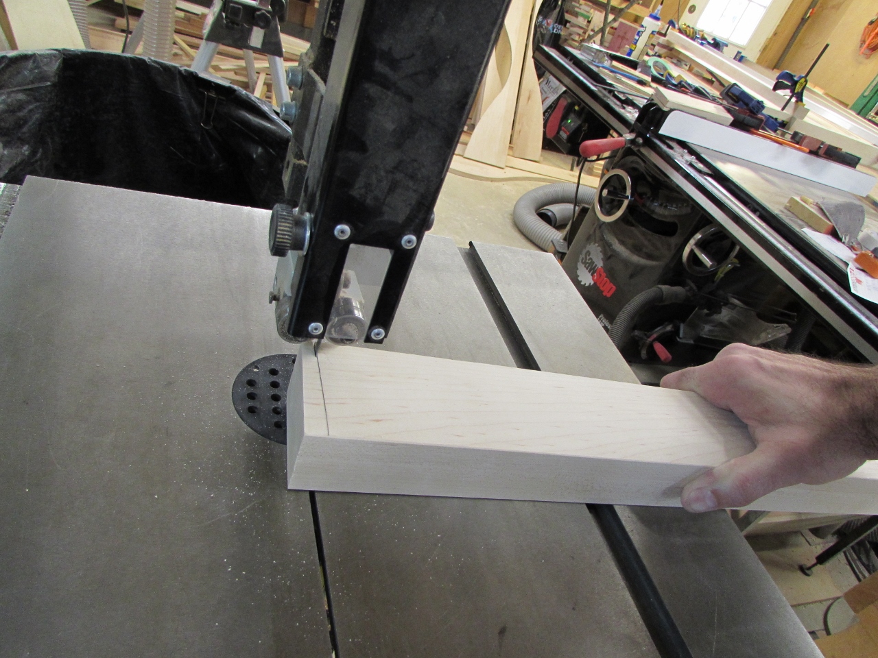 I started by clamping the top into place, so I had something to scribe the top of the side pieces with. Once I had the slight curve of the top rail, I cut both sides down on the bandsaw.