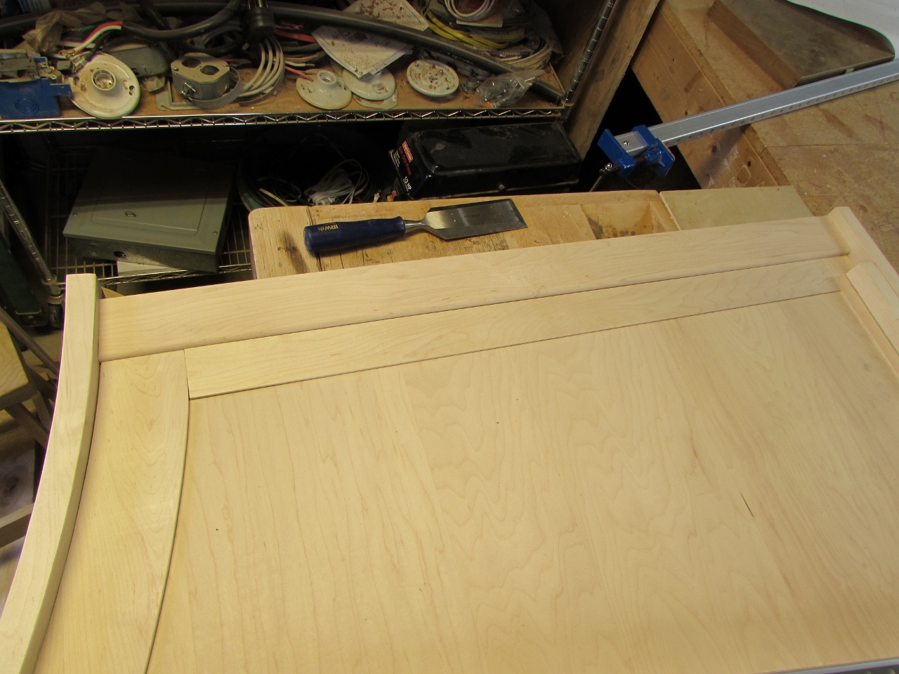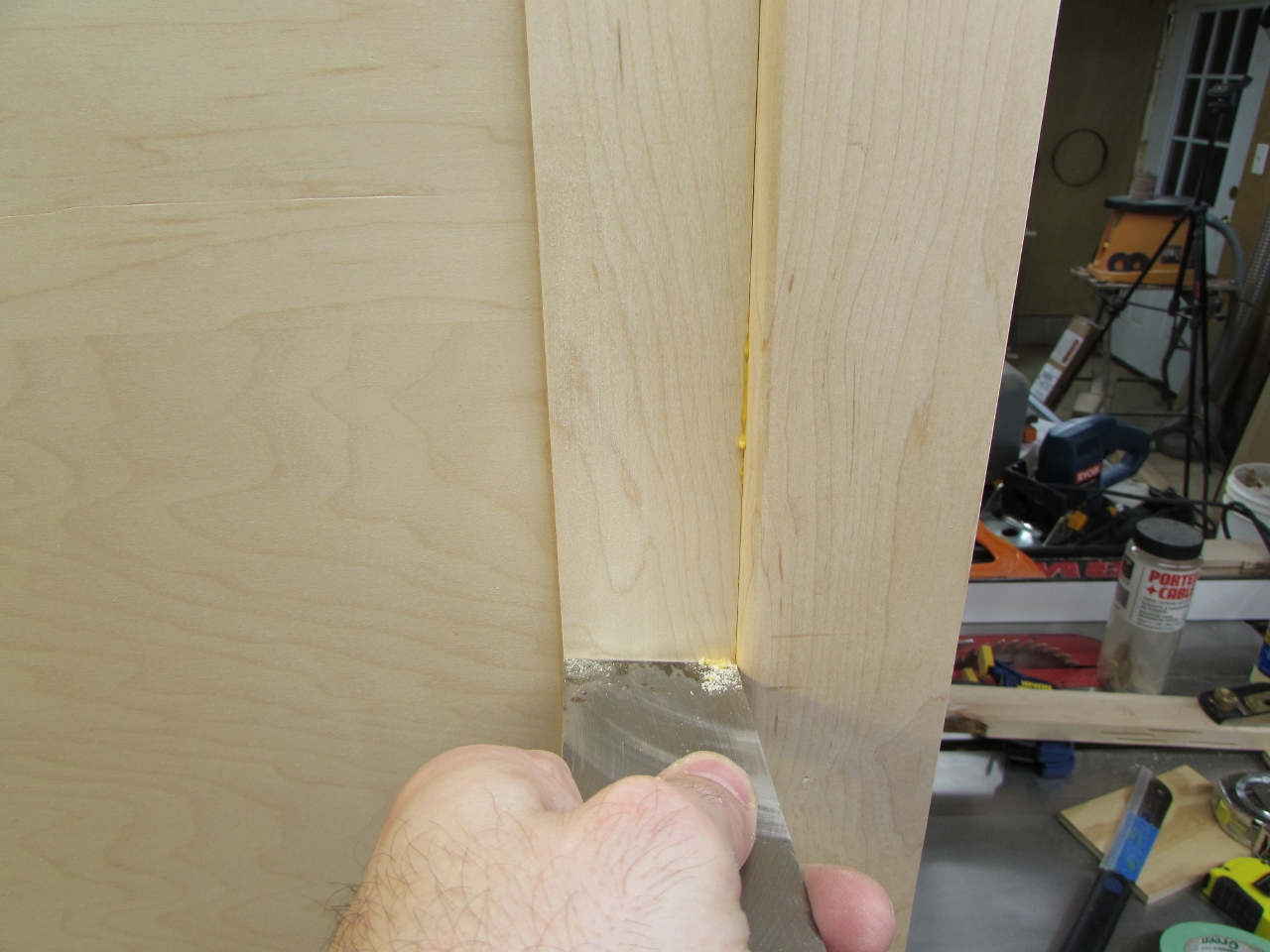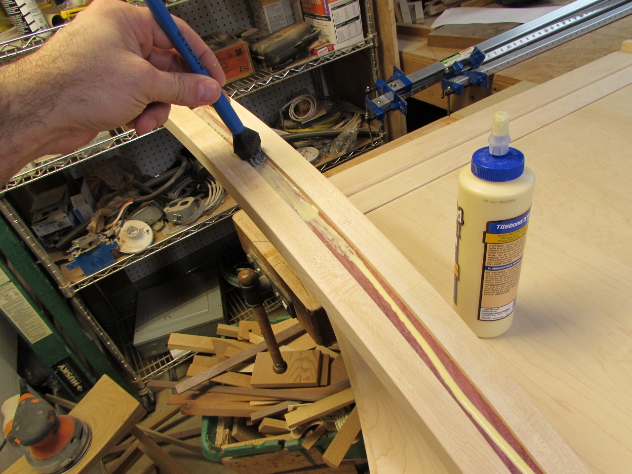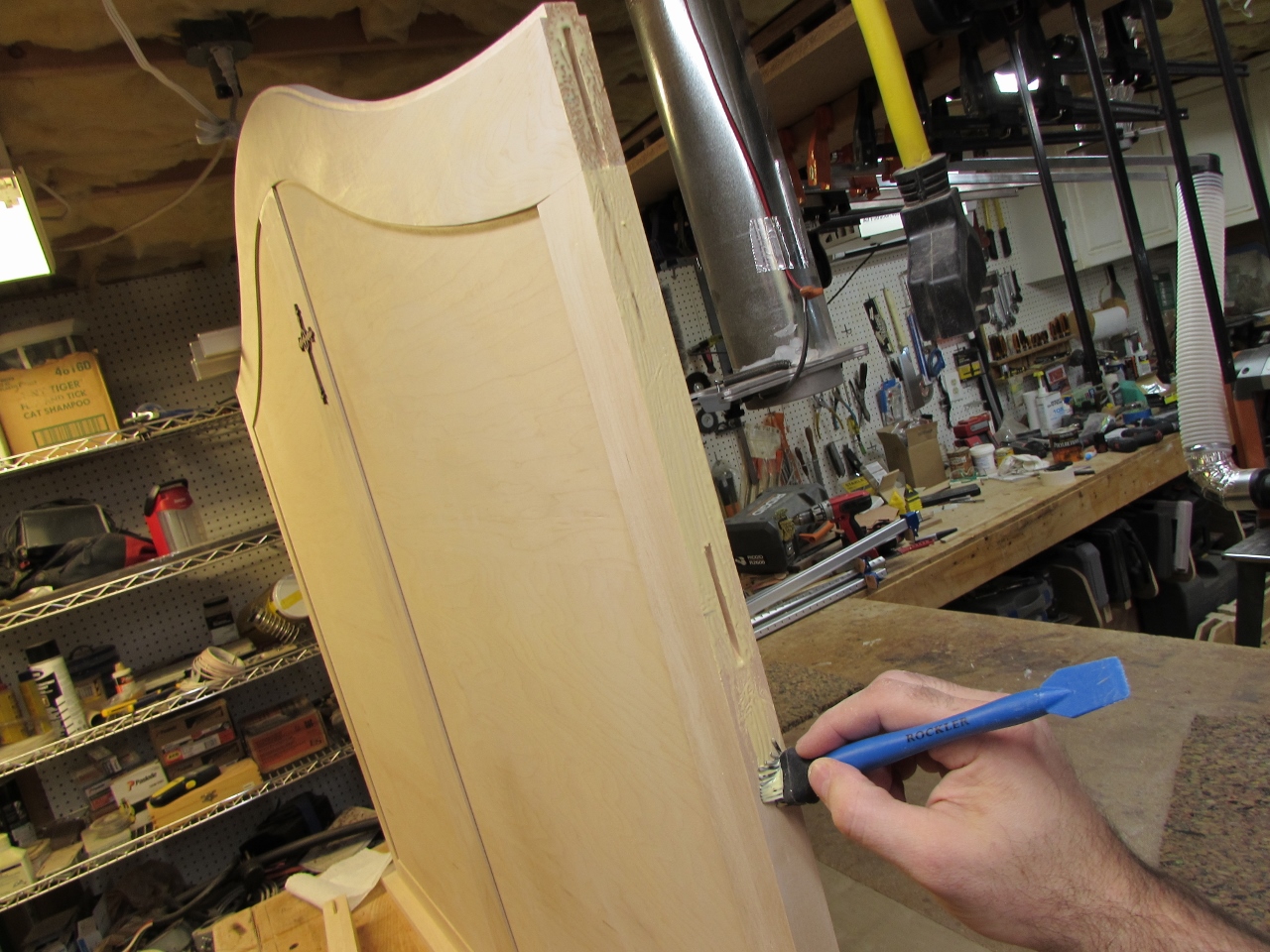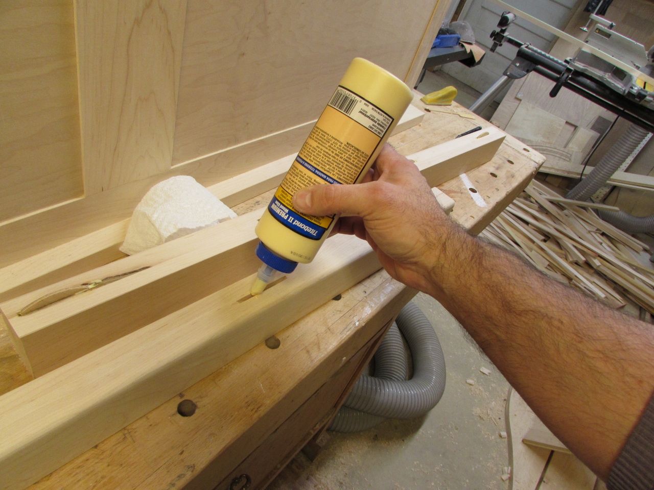 After an hour, the glue had set enough to pull the clamps. I used my 2″ chisel as a scraper to remove any excess glue. Next I turned the top rail upside down and painted the channel with wood glue.