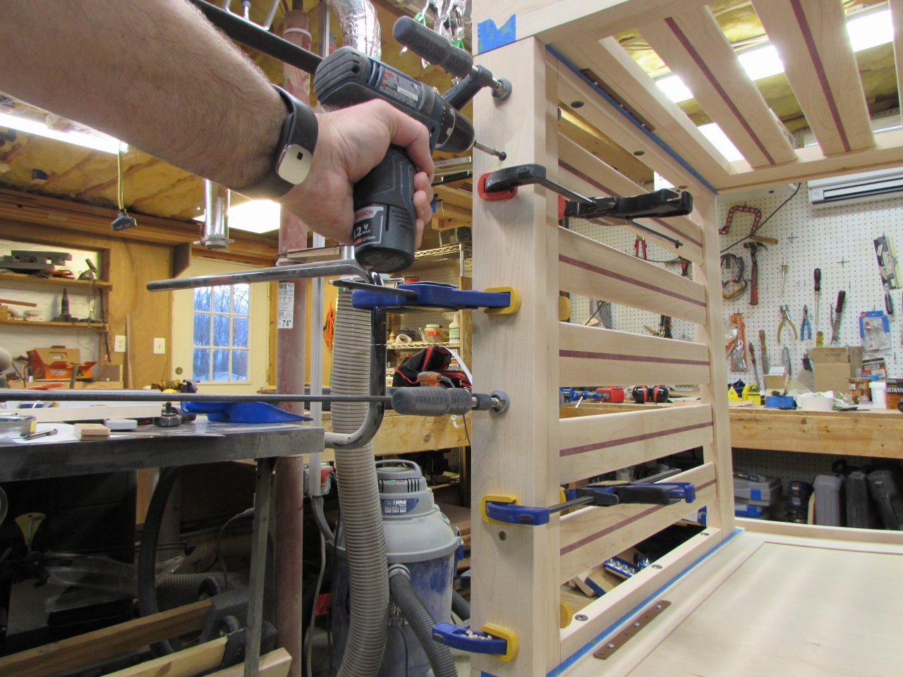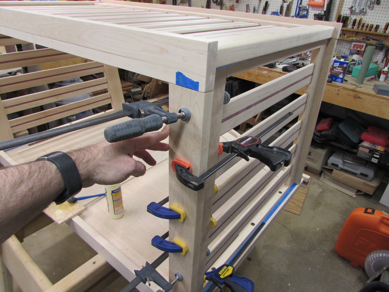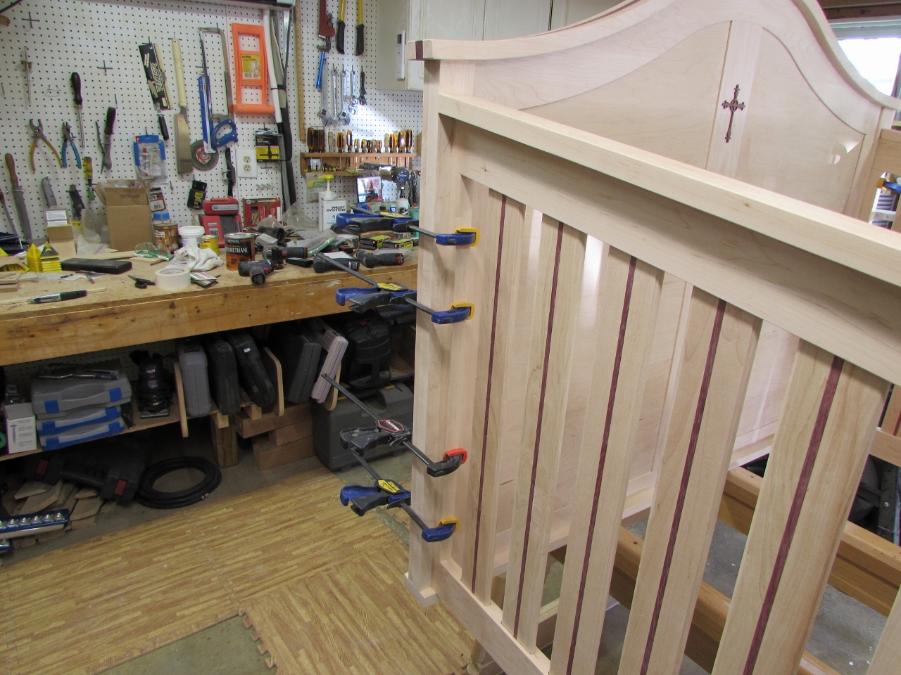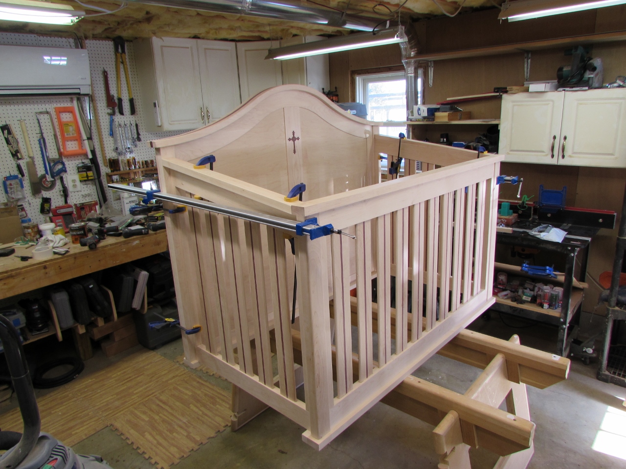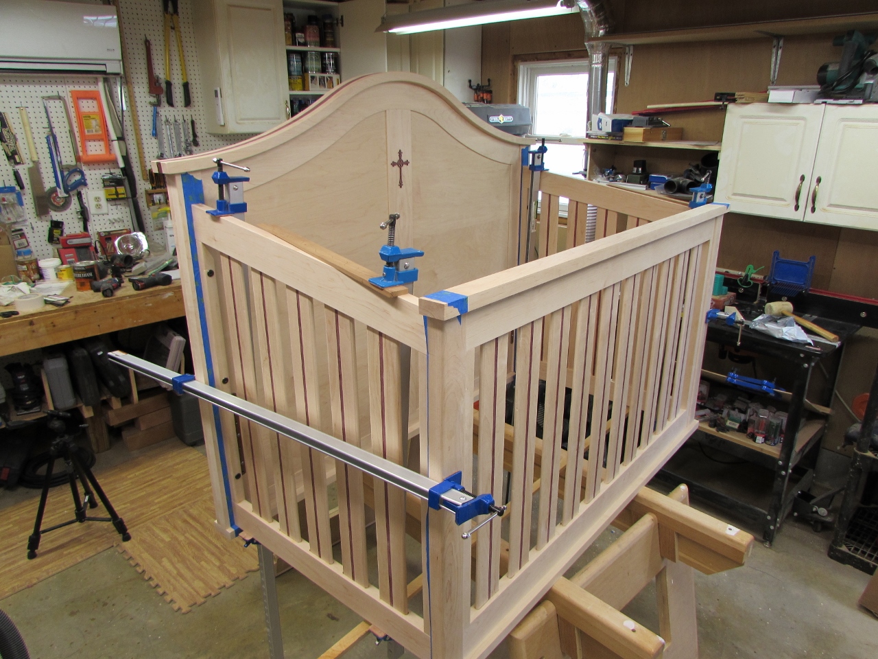 I set up my knock-down workstation, then assembled the sides and clamped the whole crib together.