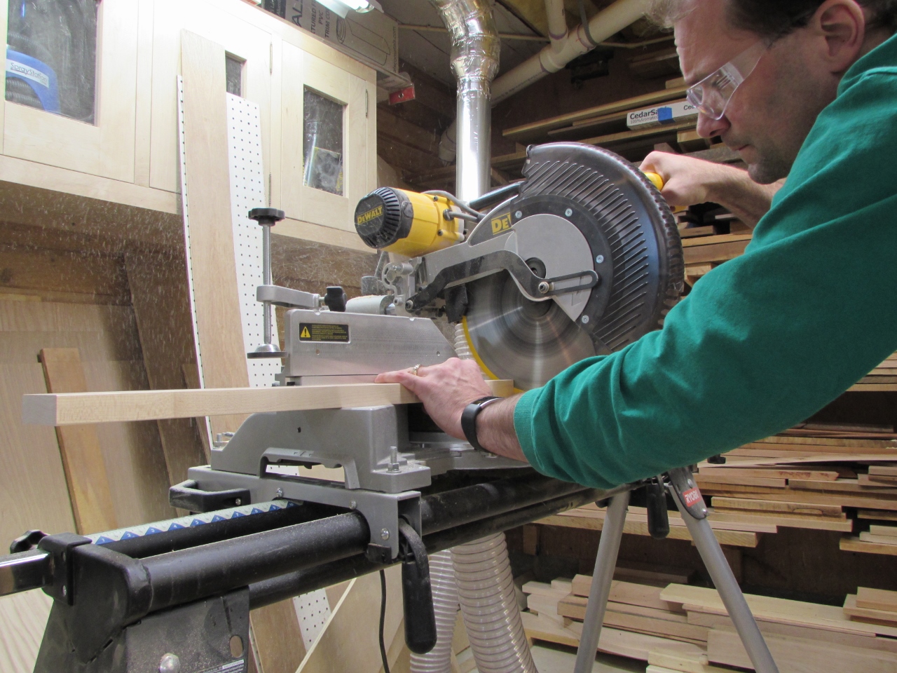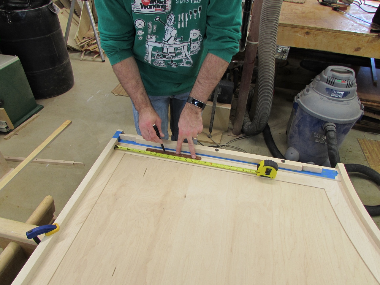 When the top rails were dry, I moved on to the bottom ones. I set them in place and marked a scribe line along the back of the front rail. This told me how long to cut the rail. I cut them so they fit snuggly against the tape. When the tape is removed, there will be a tiny bit of clearance, the thickness of my tape, but that is ok.