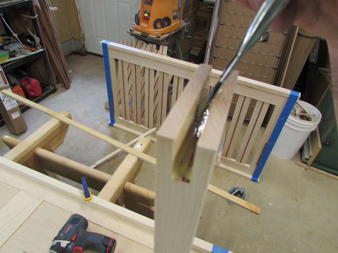 I attached the bottom rails first, then I stood the headboard back up, and started glueing in the slats.